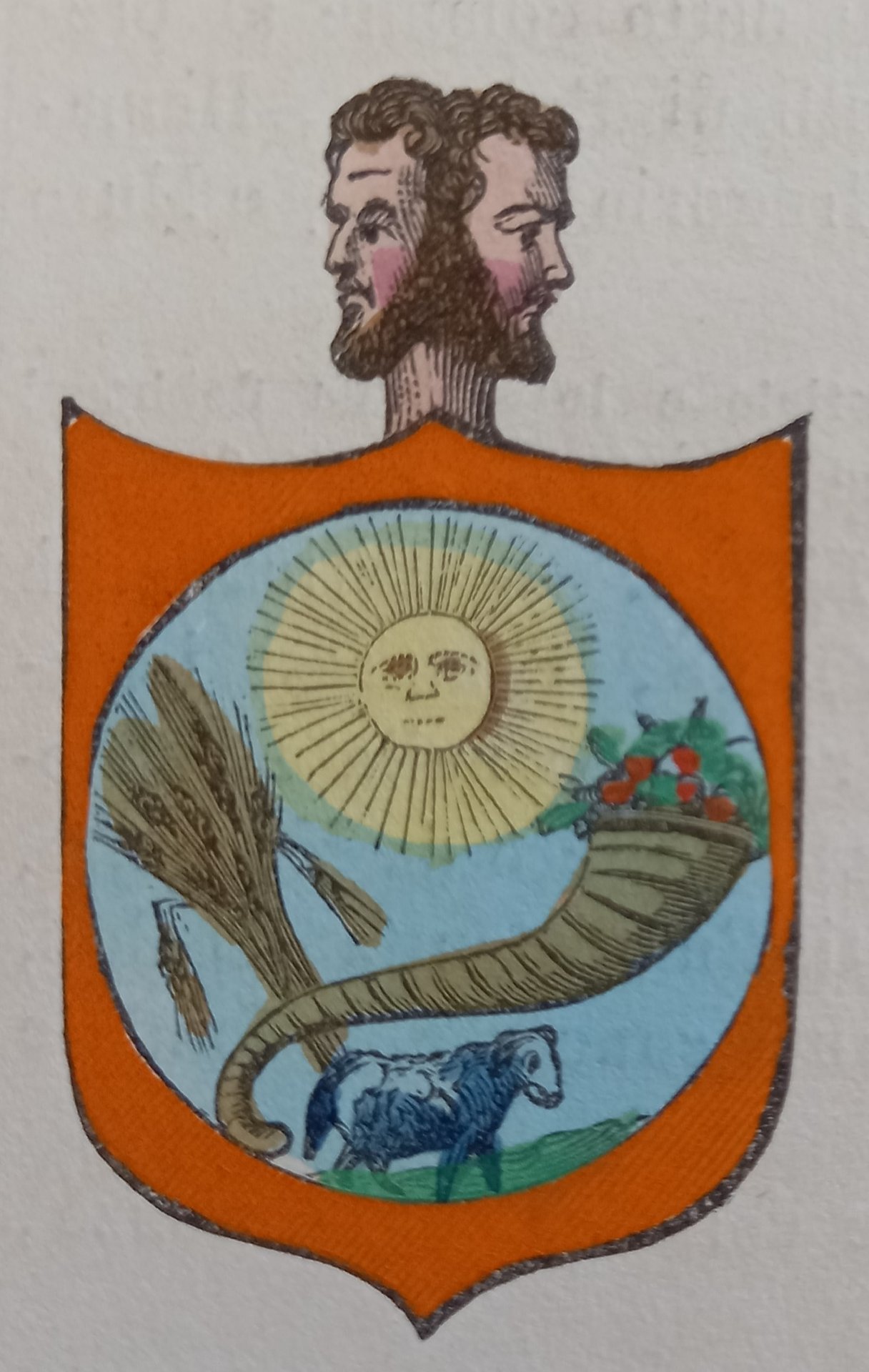 Piccolo stemma comunale colorato a mano d’epoca (cm. 3,8 x 3,2 ca.). Stralcio dal Dizionario Corografico illustrato dell’Italia, edito a Milano nel 1868. Ogni stemma di questa raccolta è inserito in una o più pagine di testo con la descrizione della località, notizie storico - geografiche e statistiche (numero degli abitanti e degli elettori, guarnigioni della Guardia Nazionale, ecc.). Spesso il testo è redatto da studiosi locali o dai sindaci, con maggiori, interessanti notizie.