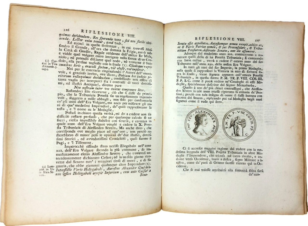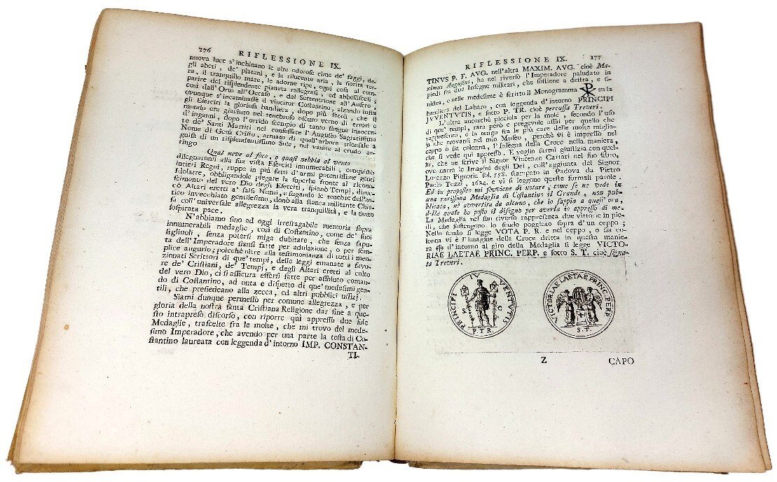 >in-4, pp. (16), 232, legatura coeva p. perg. (difetti alle cuffie ed agli spigoli). Frontespizio a stampa rossa e nera con vignetta inc., testatina inc. con le armi di Mons. Lodovico Gualterio, arcivescovo di Mira e nunzio presso il regno delle Due Sicilie, cui l'opera è dedicata; testatine, iniziali e finalini incisi; testo di antiche iscrizioni e numerose medaglie e monete incisi n.t. Prima edizione di quest'opera d'interesse storico in cui, come avverte Cicognara, "l'autore attacca il Muratori (non sempre senza ragione) intorno 10 punti storici, con altrettante dissertazioni". Bell'esemplare, marginoso e nititamente impresso. Cicognara 3359.