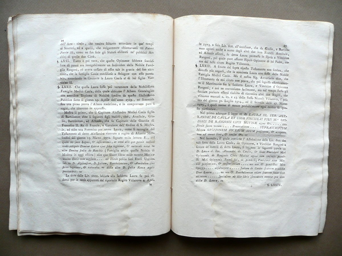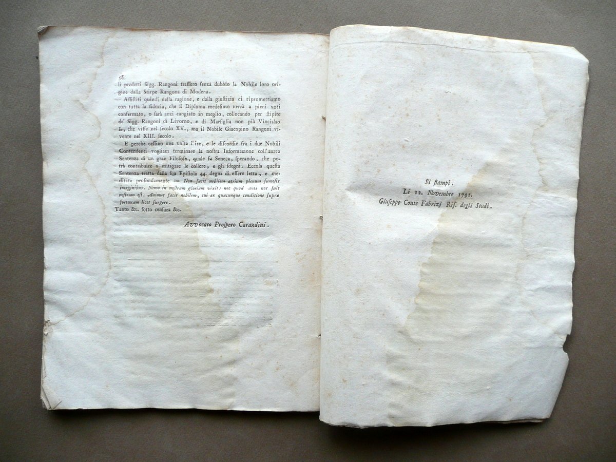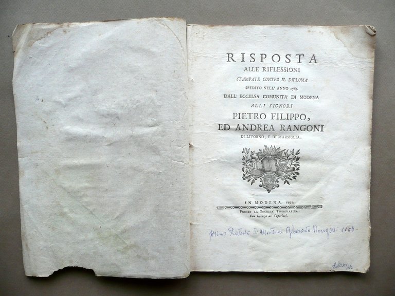 Risposta alle riflessioni stampate contro il Diploma spedito nell'anno 1769 dall'eccelsa comunità di Modena alli Signori Pietro Filippo, ed Andrea Rangoni di Livorno, e di Marsiglia Presso la Società Tipografica, Modena 1791, cm 27,5x21, pp. 60 con una bella testatina e capolettera incisi; marca tipografica incisa al frontespizio; brossura muta d'epoca. Margine inf. del frontespizio con una vecchia annotazione a penna blu (vedi foto). Condizioni di conservazione Esemplare complessivamente ben conservato con tracce d'uso e del tempo; alcune minime bruniture; brossure con qualche piccolo lieve alone, tracce di pieghette agli angoli e un paio di piccole mancanze ai margini; brossura ant. con qualche minima traccia di vecchia etichetta applicata. Angolo sup. e margine est. di alcune pagine con una leggera ombra di gora che non compromette la lettura del testo (vedi foto); angoli di qualche pagina con una piccola pieghetta; margine est. delle pp. 55-60 con una minima mancanza. Interessante storia documentata della famiglia Rangoni, nel suo ramo di Modena - Spilamberto e nei successivi di Livorno e di Marsiglia. SETT112.L10721 N
