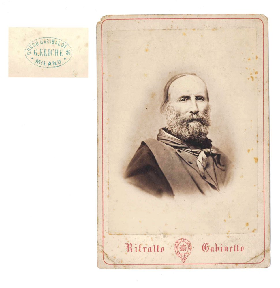 FOTOGRAFIA Stampa fotografica vintage. Albumina su cartone originale. Formato cabinet portrait (130x100 mm), supporto (164x111 mm). La fotografia ritrae Garibaldi in primo piano a mezzo busto con il fazzoletto rosso annodato al collo, opera del fotografo milanese Kliche. La foto dovrebbe essere del periodo 1862-63.