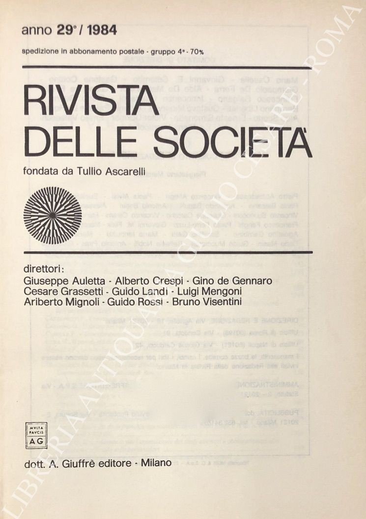 Rivista delle società. Fondata da Tullio Ascarelli. Diretta da Giuseppe Auletta, Alberto Crespi, Gino De Gennaro, Cesare Grassetti, Guido Landi, Luigi Mengoni, Ariberto Mignoli, Guido Rossi, Bruno Visentini. Anno 29° - 1984