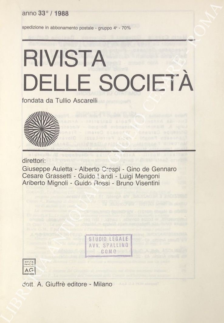 Rivista delle società. Fondata da Tullio Ascarelli. Diretta da Giuseppe Auletta, Alberto Crespi, Gino De Gennaro, Cesare Grassetti, Guido Landi, Luigi Mengoni, Ariberto Mignoli, Guido Rossi, Bruno Visentini. Anno 33° - 1988