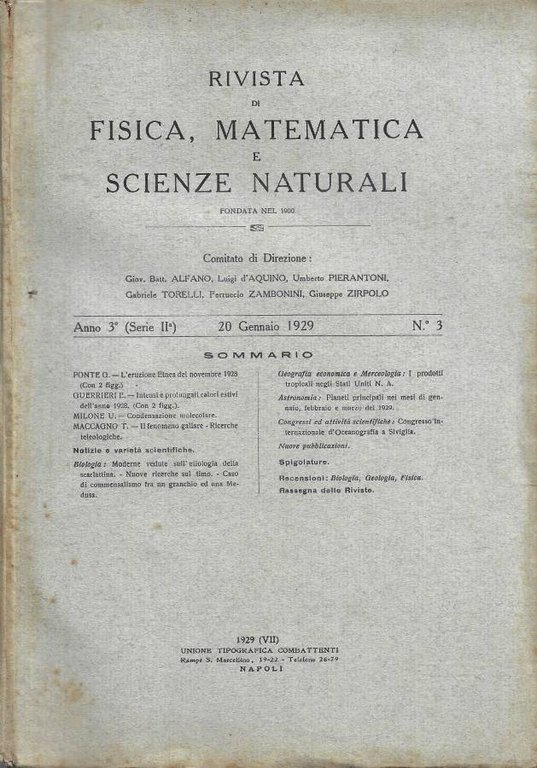 Rivista di Fisica, Matematica e Scienze Naturali - Anno 3° (Serie II) - 1929 - N. 3 (20 Gennaio) | Libri antichi e moderni |