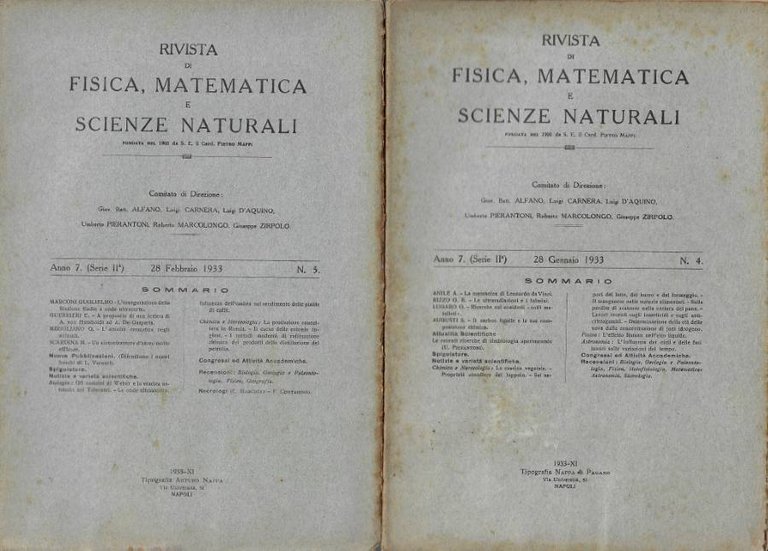Rivista di Fisica, Matematica e Scienze Naturali - Anno 7° (Serie II) - 1933 - N. 4 (28 Gennaio), N. 5 (28 Febbraio)