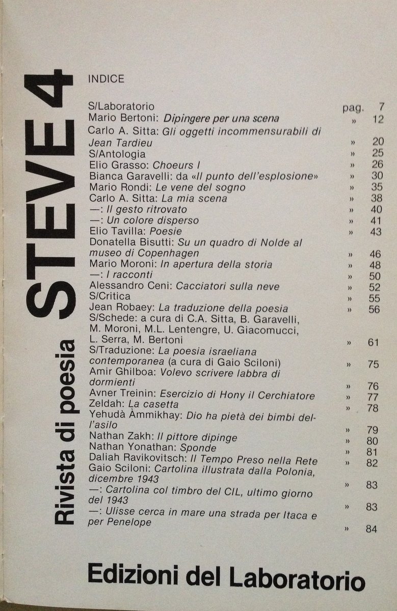 Rivista di Poesia, STEVE 4 Manifestazioni artistiche modenesi Edizioni del Laboratorio 1985, cm 21x14, pp 94, ill. in b/n f.t, cartoncino ed. ill. Condizioni di conservazione Esemplare in buone condizioni con leggere tracce d'uso; cartoncino editoriale con qualche abrasione ai piatti, agli angoli, ai margini e al dorso. SETT108.L10484 MT
