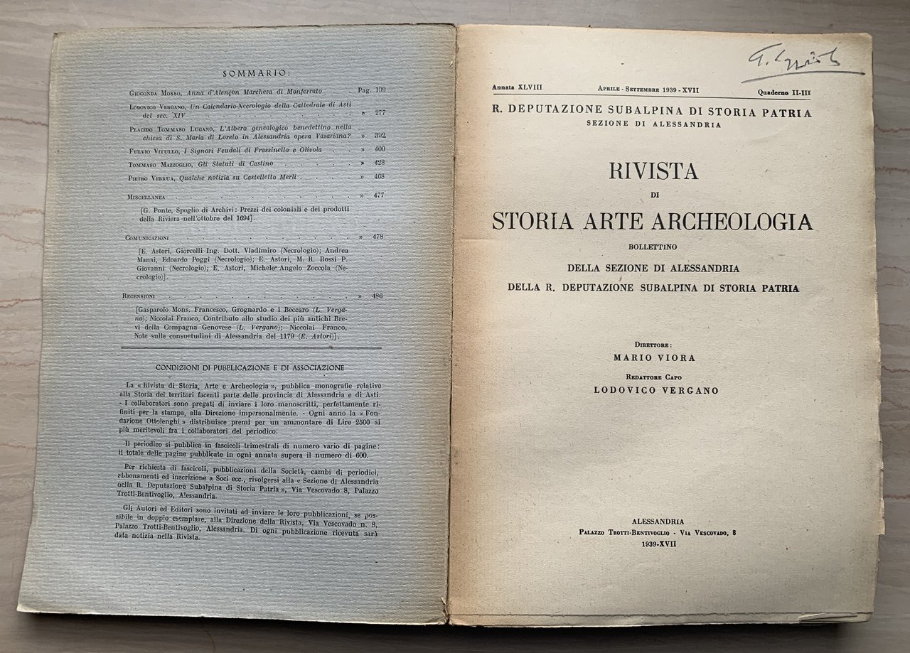 - Novecento periodici, bollettini, trimestrali, storia, storia patria, arte, archeologia, Alessandria, Piemonte, Prof. Mario Viora, Lodovico Vergano, Rivista di Storia Arte Archeologia / Rivista di Storia Arte e