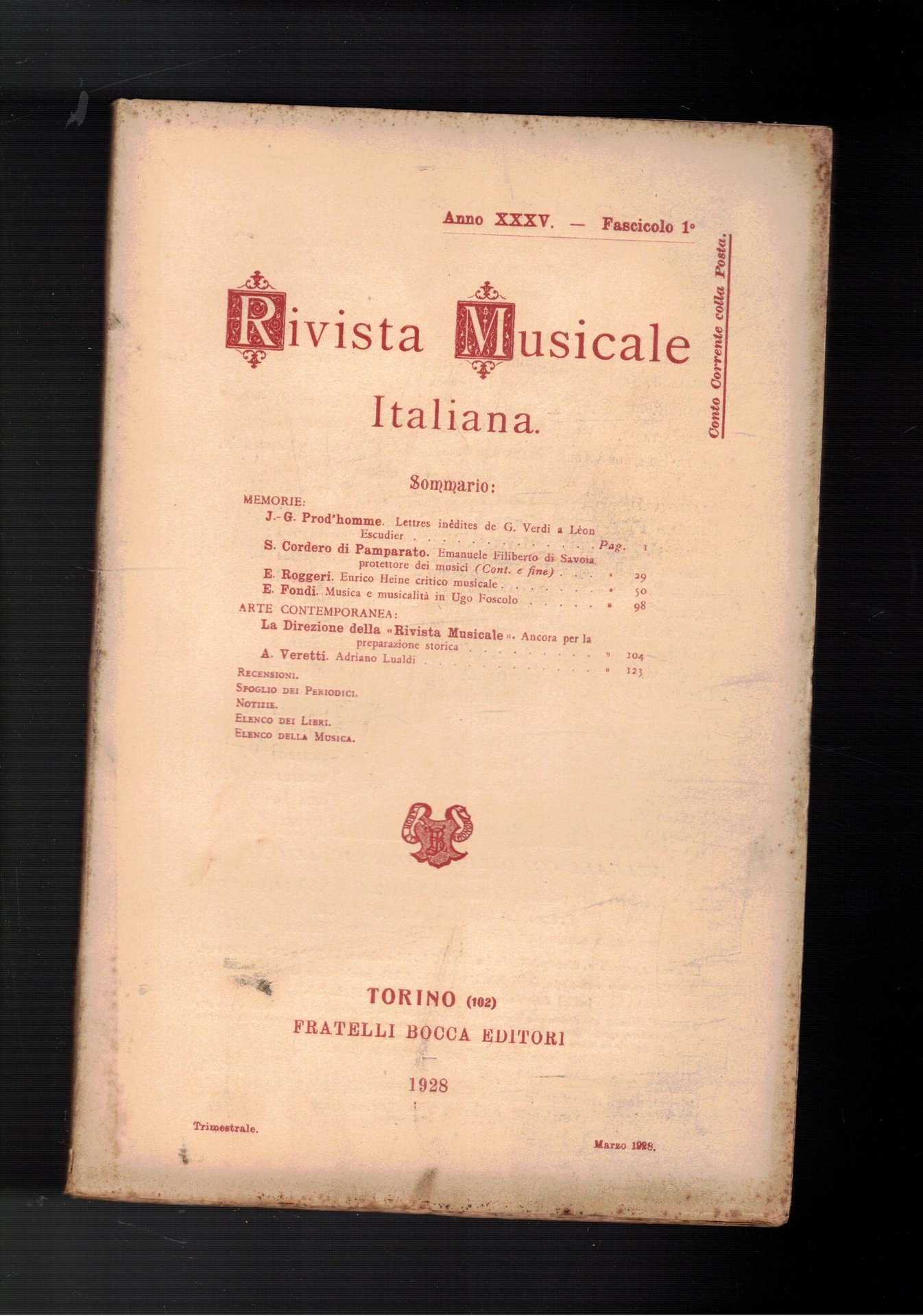 Rivista musicale italiana, trimestrale, anno XXXV del 1928. Lettres inédites de G. Verdi a Léon Escudier; il piacere estetico nei "pensieri" del Leopardi; Epistolario di musicisti; per l'introduzione del pensiero Dalcroziano nelle scuole; ecc.