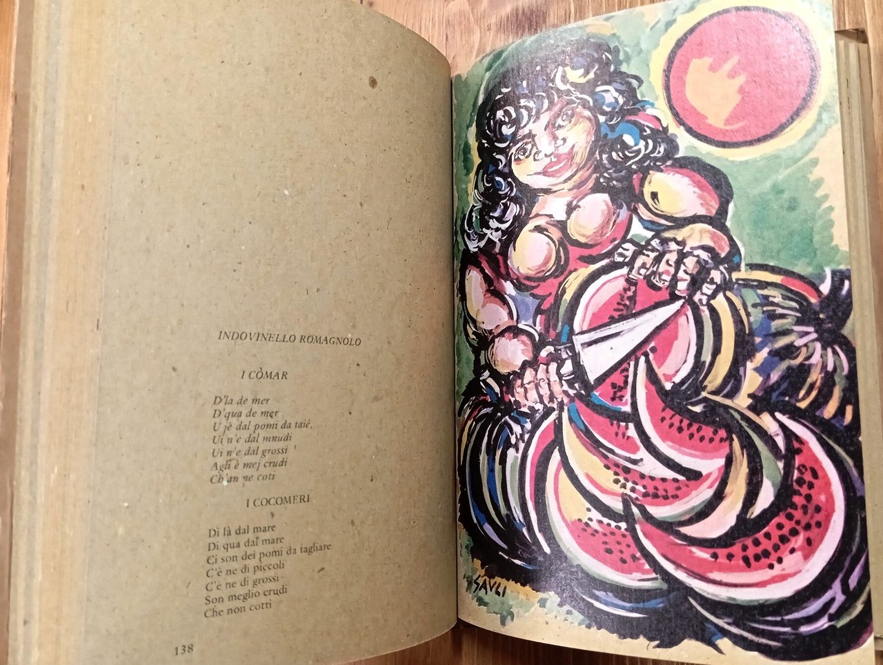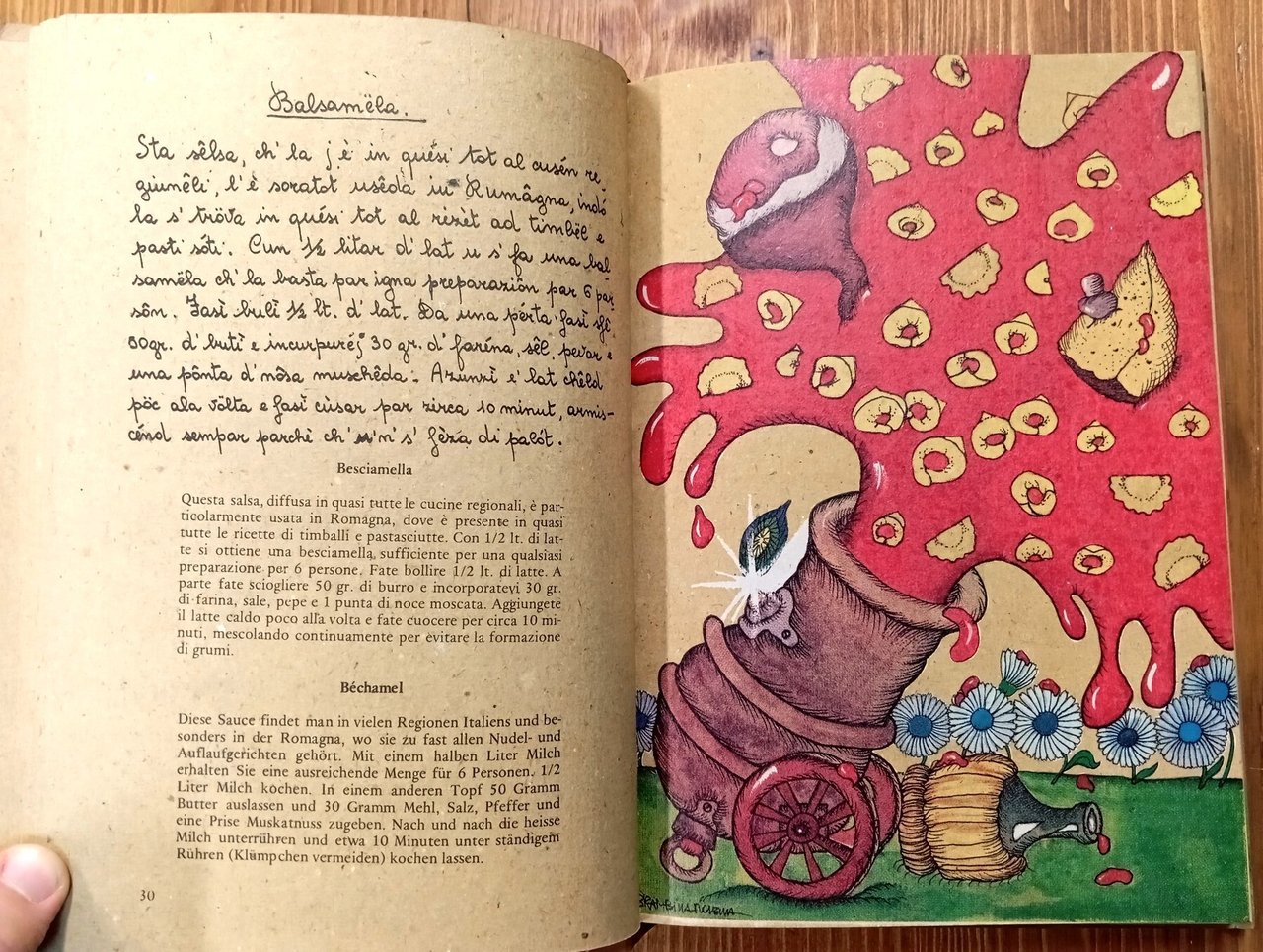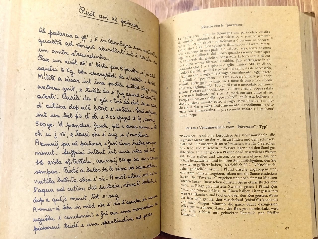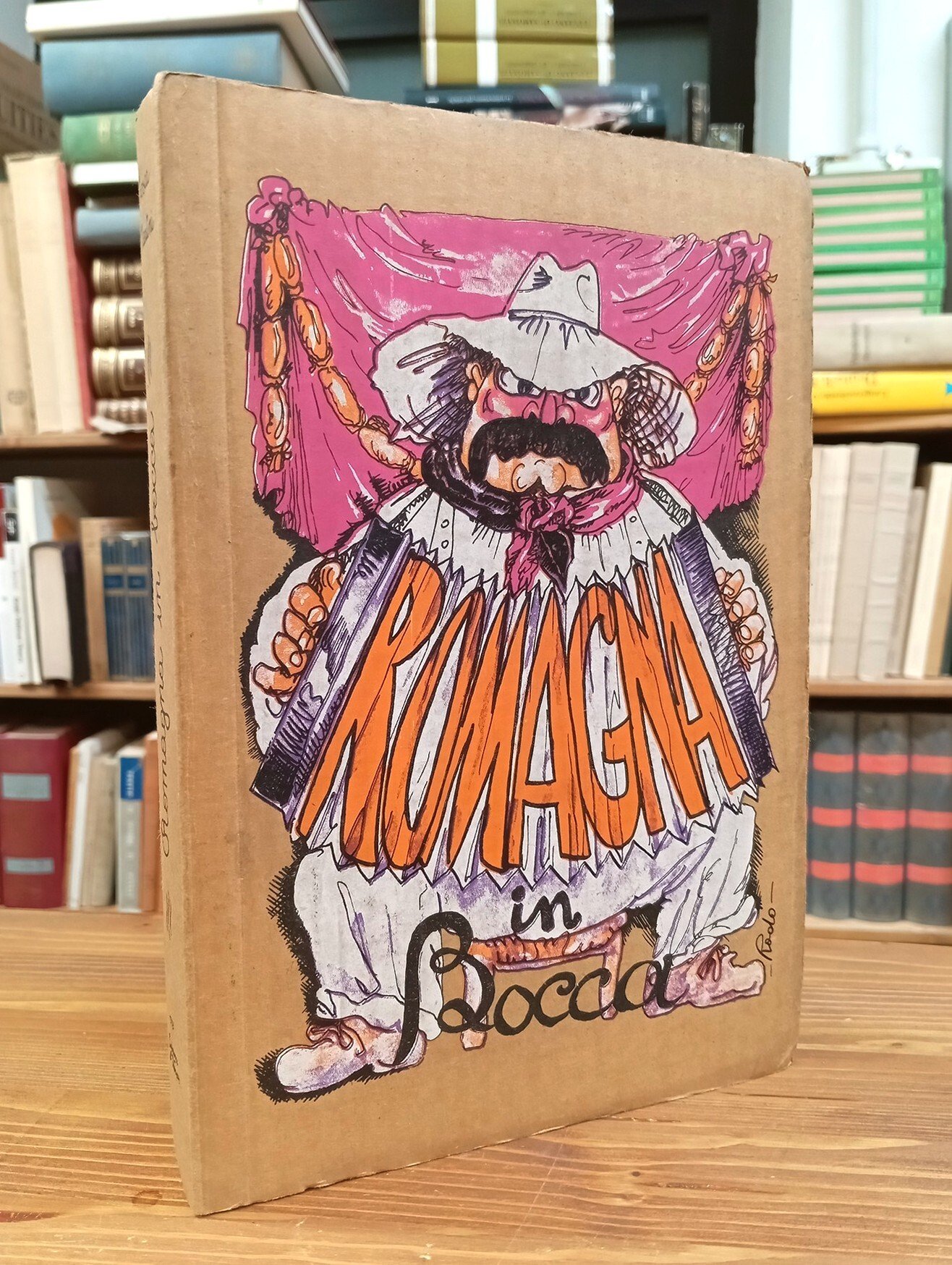 Volume in copertina editoriale cartonata illustrata a colori, 223 pagine con figure in nero nel testo e tavole a colori intercalate (illustrazioni di Vittorio Alunni, Rosella Brambilla, Andrea Sciortino, Maurizio Bonesoli, Marina Di Dio, Rudy Silvano, Pietro Gauli, Fabrizio Lupo, Paolo Fici, Paola Renzi, Paola Lazzaroni). Prefazione di Max David. Stampa su carta paglia; testo in romagnolo con traduzione italiana e tedesca a fronte. Esemplare in eccellenti condizioni di un volume di ricette non comune e ricercato.