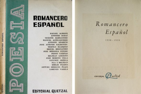 ROMANCERO Español, 1936-1939. [Rafael Alberti, Antonio Agraz, Vicente Aleixandre, Manuel Altolaguirre, Antonio Aparicio, José Antonio Balbontín, Teófilo Blázquez, Miguel Hernández, José Herrera Petere, Pedro Garfias, Beltran Logroño, José Moreno Villa, Sanchez Ortega, Pla y Beltrán, Emilio Prados, Arturo Serrano Plaja y Lorenzo Varela]. Selección de Elvio Romero. Pórtico de Rafael Alberti.