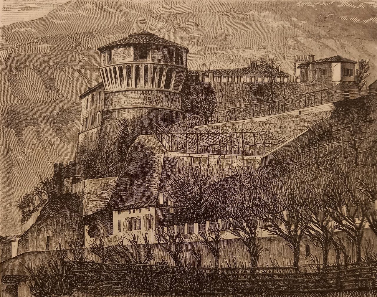 Piccolo stemma comunale colorato a mano d’epoca (cm. 3,8 x 3,2 ca.). Stralcio dal Dizionario Corografico illustrato dell’Italia, edito a Milano nel 1868. Ogni stemma di questa raccolta è inserito in una o più pagine di testo con la descrizione della località, notizie storico - geografiche e statistiche (numero degli abitanti e degli elettori, guarnigioni della Guardia Nazionale, ecc.). Spesso il testo è redatto da studiosi locali o dai sindaci, con maggiori, interessanti notizie.
