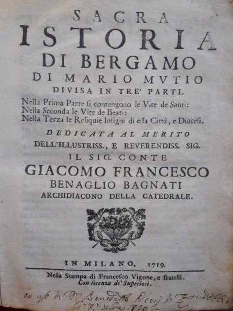 Sacra istoria di Bergamo [.] divisa in tre parti. Nella prima parte si contengono le vite dei santi, nella seconda le vite de beati, nella terza le reliquie [.].