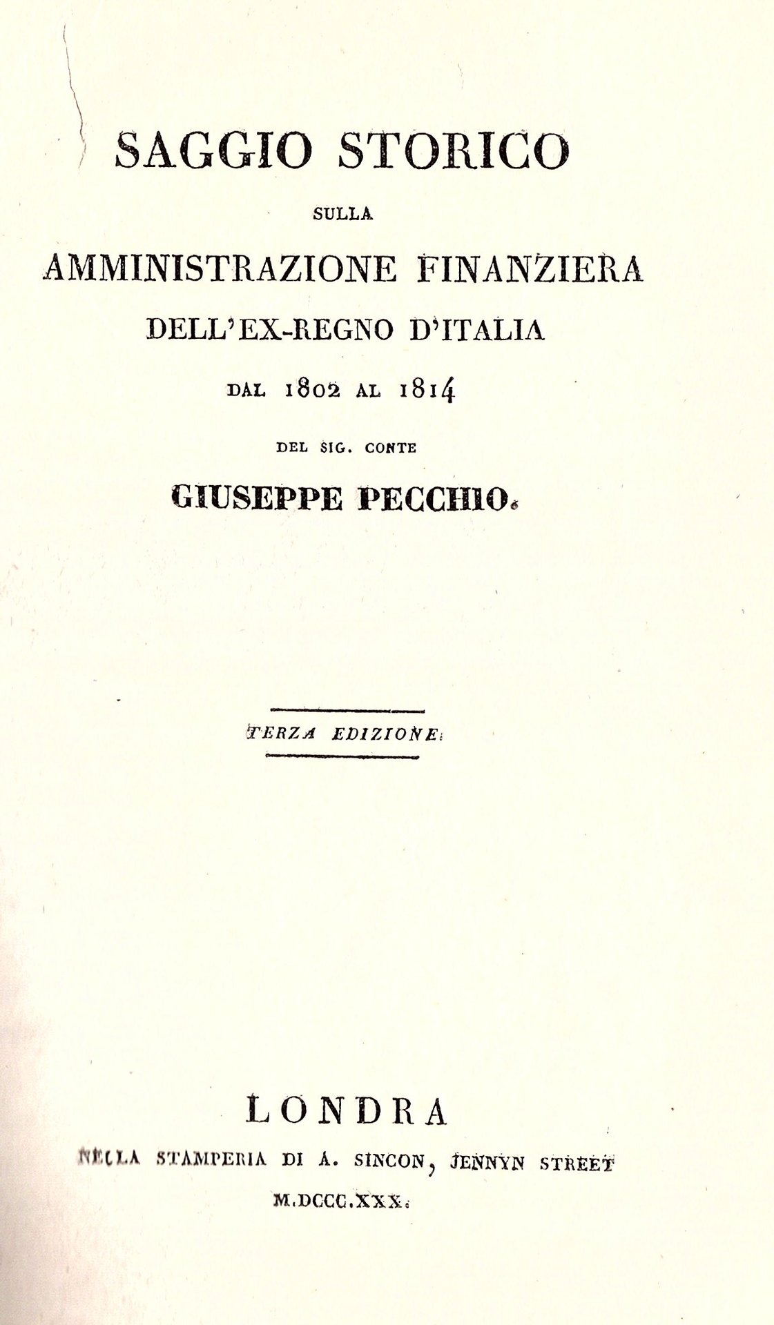 Saggio storico sulla amministrazione finanziera dell'ex Regno d'Italia dal 1802 al 1814 Terza edizione | Libri antichi e moderni | Pecchio Giuseppe