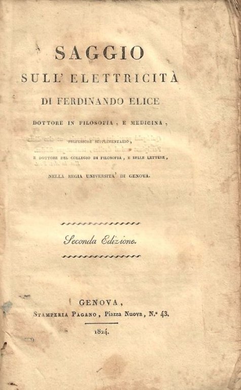 In-8°, legatura in brossurra coeva rimontata, pp.100. Fioriture al frontespizio. -(Elice Ferdinando, Loano 1786- Genova? 1847. Supplente al Gabinetto di Fisica dell’Università di Genova dal 1832 al 1839. Prese parte alle Riunioni degli scienziati italiani: Torino, 1840; Genova, 1846).