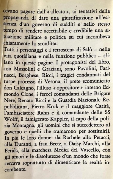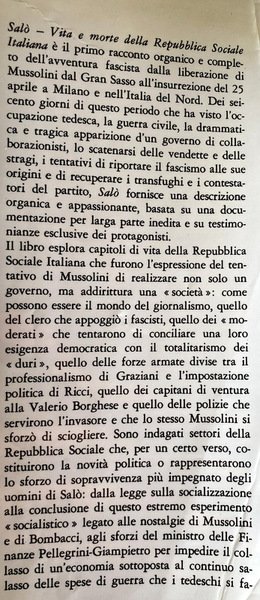 Salò - Vita e morte della Repubblica Sociale Italiana è il primo racconto organico e completo dell'avventura fascista dalla liberazione di Mussolini dal Gran Sasso all'insurrezione del 25 aprile a Milano e nell'Italia del Nord. Dei seicento giorni di questo periodo che ha visto l'occupazione tedesca, la guerra civile, la drammatica e tragica apparizione d'un governo di collaborazionisti, lo scatenarsi delle vendette e delle stragi, i tentativi di riportare il fascismo alle sue origini e di recuperare i transfughi e i contestatori del partito, Salò fornisce una descrizione organica e appassionante, basata su una documentazione per larga parte inedita e su testimonianze esclusive dei protagonisti. Il libro esplora capitoli di vita della Repubblica Sociale Italiana che furono l'espressione del tentativo di Mussolini di realizzare non solo un governo, ma addirittura una società: come possono essere il mondo del giornalismo, quello del clero che appoggiò i fascisti, quello dei moderati che tentarono di conciliare una loro esigenza democratica con il totalitarismo dei duri, quello delle forze armate divise tra il professionalismo di Graziani e l'impostazione politica di Ricci, quello dei capitani di ventura alla Valerio Borghese e quello delle polizie che servirono l'invasore e che lo stesso Mussolini si sforzò di sciogliere. Sono indagati settori della Repubblica Sociale che, per un certo verso, costituirono la novità politica o rappresentarono lo sforzo di sopravvivenza più impegnato degli uomini di Salò: dalla legge sulla socializzazione alla conclusione di questo estremo esperimento socialistico legato alle nostalgie di Mussolini e di Bombacci, agli sforzi del ministro delle Finanze Pellegrini - Giampietro per impedire il collasso di un' economia sottoposta al continuo salasso delle spese di guerra che i tedeschi si facevano pagare dall'alleato, ai tentativi della propaganda di dare una giustificazione all'esistenza d'un governo di sudditi e nello stesso tempo di rendere accettabile e credibile una situazione militare e politica su cui incombeva chiaramente la sconfitta. Tutti i personaggi e i retroscena di Salò - nella vita quotidiana e nella funzione pubblica - sfilano in queste pagine. I protagonisti del libro, con Mussolini e Graziani, sono Pavolini, Farinacei, Borghese, Ricci, i tragici condannati del turpe processo di Verona, il prete scomunicato don Calcagno, l'illuso oppositore interno Edmondo Cione, i feroci comandanti delle Brigate Nere, Renato Ricci e la Guardia Nazionale Repubblicana, Pietro Kock e il maggiore Carità, l'ambasciatore Rahn e il comandante delle SS Wolff, il famigerato Kappler, il capo della polizia Montagna, gli uomini che si succedettero al governo e quelli che tramarono per sostituirli. In più le loro donne: da Rachele alla Petacci, alla Duranti, a Frau Beetz, a Daisy Marchi, alla Ferida, alla marchesa Medici del Vascello, con gli amori e le dissolutezze d'un mondo che forse cercava soprattutto di dimenticare la realtà incombente.