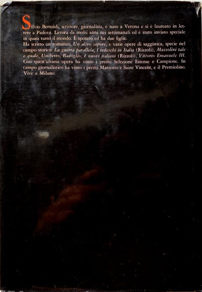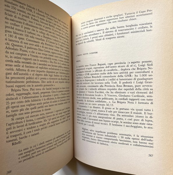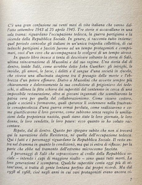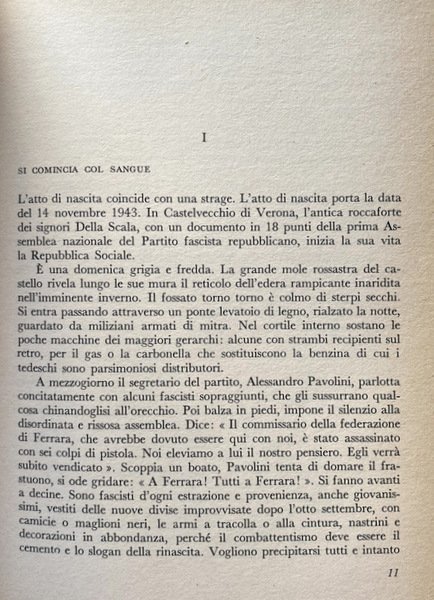 Soggetti: Storia contemporanea, Repubblica sociale italiana, Collaborazionisti, Gran Sasso, Insurrezione, 25 Aprile, Guerra civile, Clero, Chiesa, Novecento, Fascismo, Benito Mussolini, Armistizio, 8 settembre, Germania, Nazismo, Occupazione, Nazi-fascismo, Nazionalsocialismo, Ideologie politiche, Regno, Badoglio, 1943-1946, Resistenza, Soria d'Italia, 1942-1945, Frederick William Deakin, Giovanni Dolfin, Susmel, Pansa, Partigiani, Seconda Guerra Mondiale, Alleati, Americani, Fascisti, Ventennio, Regime fascista, Memorialistica, Testimonianze, Archivio Centrale, Protagonisti, Giorgio Pini, Lettere inedite, Interviste, Bibliografia, Saggi storici, Libri Vintage Fuori catalogo, Ferrara, Verona, Castelvecchio, Alessandro Pavolini, Galeazzo Ciano, Gran Consiglio, Ministri, Brigata Nera, Franco Bogazzi, Borghesia veneziana, Rachele, Villa Feltrinelli, Garda, Canevani, Rodolfo Graziani, Adolf Hitler, Goebbels, Aviazione, Marina, Camerati, Esercito, Fratelli Cervi, Rappresaglie, Roveda, Duce, Processo, Condanna, Morte, Piazzale Loreto, Bologna, Attentati, Gentile, Eugenio Apollonio, Tamburrini, Valenti, Ferida, Villa Triste, Pietro Koch, SQUADRISTI, Assassinii politici, Radio Tevere, Liberazione, Roma, Stampa, Editoria, Cuneo, Bilancio, Commercio, Terzo Reich, Hitler, Preziosi, Ebrei, Antisemitismo, Leggi, Stragi, Deportazioni, Lago di Como, Marienbad, Generale Wolff, Ammiragli, Discorsi, Resa, Orge, Documenti, Popolo, Peccati, Acquarone, Anfuso, Ermanno Amicucci, Balbo, Barracu, Calcagno, Guido Guidi Buffarini, Nicola Bombacci, Evola, Einaudi, Roberto Farinacci, Benedetto Croce, Gabriele D'Annunzio, De Felice, Himmler, Kappler, Kesserling, Tommaso Marinetti, Lloyd, Moelhaussen, Renzo Montagna, Mezzasoma, Pettinato, Rahn, Utimperghe, Pellegrini, Economia, Caduta, Collasso, Crisi, Giornalismo, Giornalisti, Totalitarismo, Vendette, Edmondo Cione, don Calcagno, Guardia Nazionale, Polizia, Claretta Petacci, Marchesa Medici del Vascello, Dissolutezze, Frau Beetz, Doris Duranti, Daisy Marchi, Oro, Dongo, Camicie nere, Contemporary history, Italian social Republic, Collaborationists, Insurrection, Civil war, Clergy, Church, Twentieth century, Fascism, Armistice, September 8, Germany, Nazism, Occupation, Nazi-fascism, National Socialism, Political ideologies, Kingdom, Resistance, Italy, Partisans, Second World War, Allies, Americans, Fascists, Twenty Years, Fascist Regime, Memorial, Testimonials, Central Archive, Protagonists, Unpublished Letters, Interviews, Bibliography, Historical Essays, Out of Print Books, Grand Council, Ministers, Black Brigade, Bourgeois Venetian, Air Force, Navy, Comrades, Army, Reprisals, Trial, Condemnation, Death, Attacks, TEAMS, Political assassinations, Liberation, Rome, Press, Publishing, Budget, Commerce, Jews, Anti-Semitism, Laws, Massacres, Deportations, Admirals, Speeches, Surrender, Orgies, Documents, People, Sins, Economy, Fall, Collapse, Crisis, Journalism, Journalists, Totalitarianism, Revenge, National guard, Police, Gold, Black Shirts