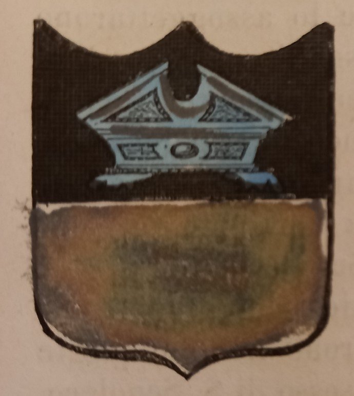 Piccolo stemma comunale colorato a mano d’epoca (cm. 3,8 x 3,2 ca.). Stralcio dal Dizionario Corografico illustrato dell’Italia, edito a Milano nel 1868. Ogni stemma di questa raccolta è inserito in una o più pagine di testo con la descrizione della località, notizie storico - geografiche e statistiche (numero degli abitanti e degli elettori, guarnigioni della Guardia Nazionale, ecc.). Spesso il testo è redatto da studiosi locali o dai sindaci, con maggiori, interessanti notizie.