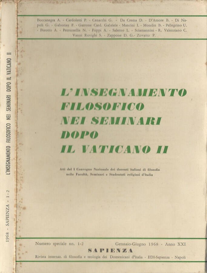 Numero speciale "1-2" dell'anno XXI della rivista di filosofia "Sapienza" rispettivamente dell'anno 1968. la copertina, in cartoncino morbido, leggermente ingiallita dal tempo, presenta lievi segni di usura ai margini sporiche macchioline di fioritura a ridosso degli stessi. Pagine lievemente ingiallite. Numero pagine 304.