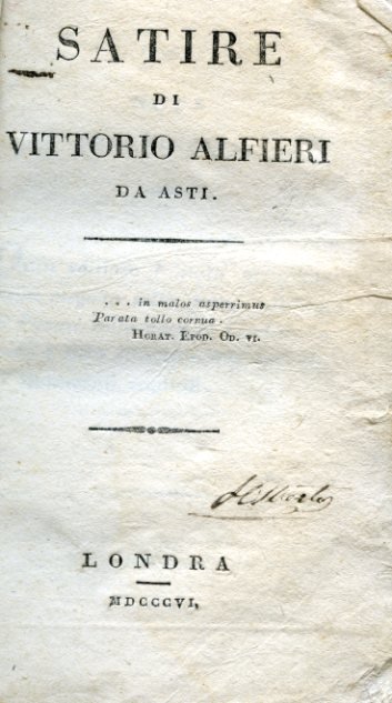 In-16°, pp. 107, brossura coeva blu, reintegrazione dell'angolo inferiore destro del frontespizio. Annotazioni manoscritte coeve al verso dell'indice finale. Bruniture e fioriture sparse. Terza edizione assoluta, dopo le due del 1804, la prima apparsa con il falso luogo di Basilea e la seconda (in realtà fiorentina) col falso luogo di Londra. 'Quest'edizione è stata accuratamente eseguita sulla prima edizione di Firenze colla data di Londra, la quale è stata diligentemente corretta su' Manoscritti originali' (dalla nota dell'editore). Scrisse il De Sanctis a proposito delle 'Satire' alfieriane: 'Nell'ironia pariniana senti un nuovo mondo affacciarsi nel sicuro possesso di se stesso. Nel sarcasmo alfieriano senti il ruggito di non lontane rivoluzioni'. Bustico, p. 59, n. 312. Parenti, Falsi luoghi, p. 127: 'Bustico non fa ipotesi sul vero luogo di stampa'. Cfr. Mario Fubini in Diz. Bompiani d.Opere, VI, 525.