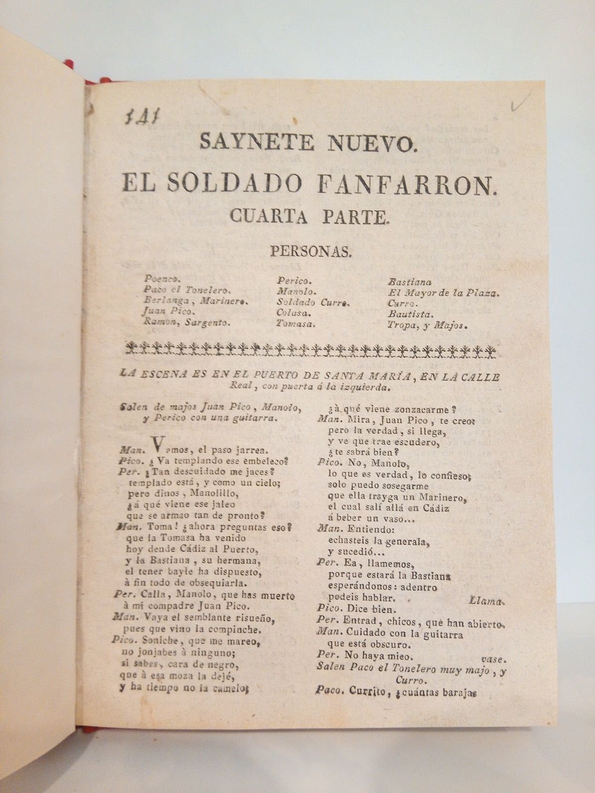 Valencia: Imprenta de Domingo y Mompié, 1821.- 8 p.; 4º menor (20,5 x 15,2 cm); Impresión a dos columnas; Tela Nueva.- (Saynete Nuevo. Nº 141).* En excelente estado de conservación. TEATRO ESPAÑOL DESDE SUS ORÍGENES HASTA EL SIGLO XVIII