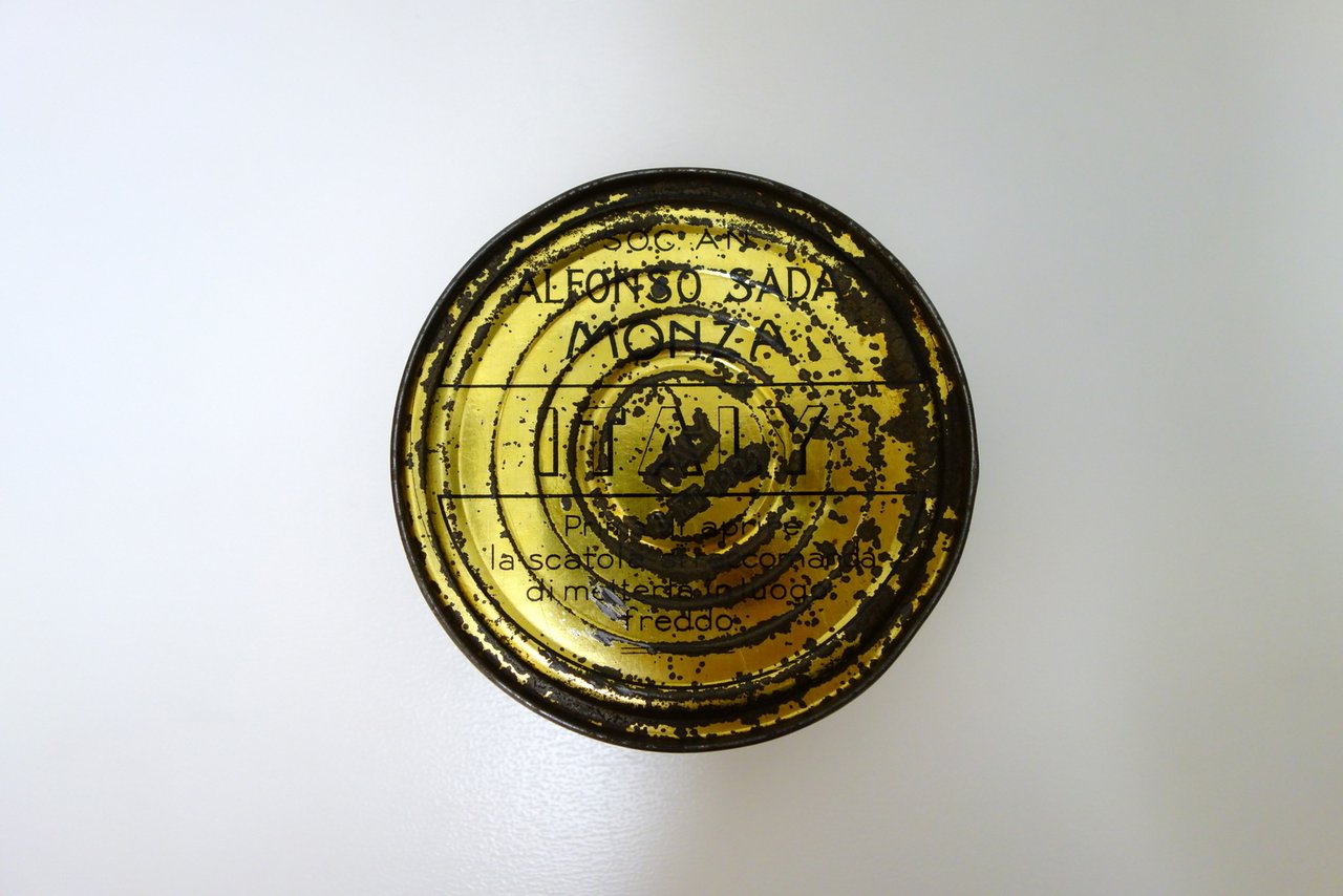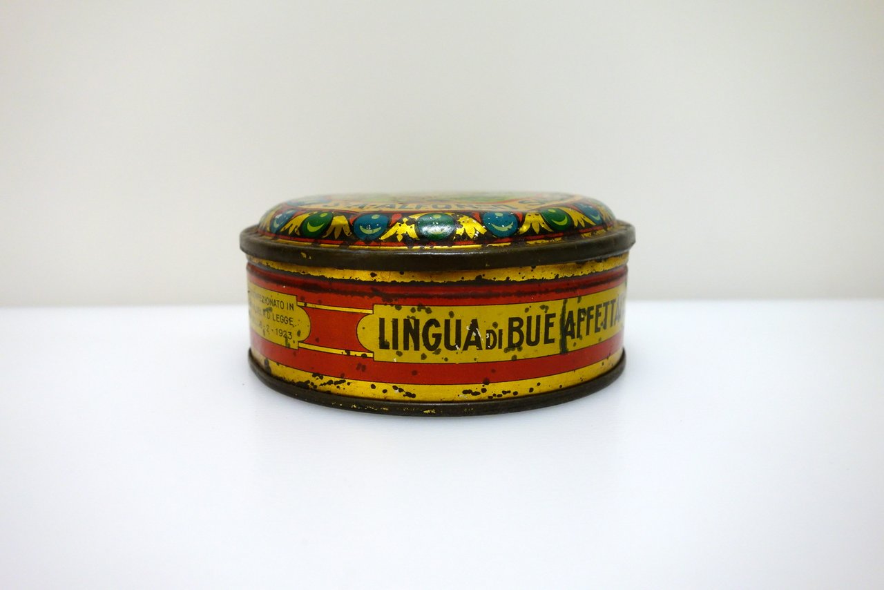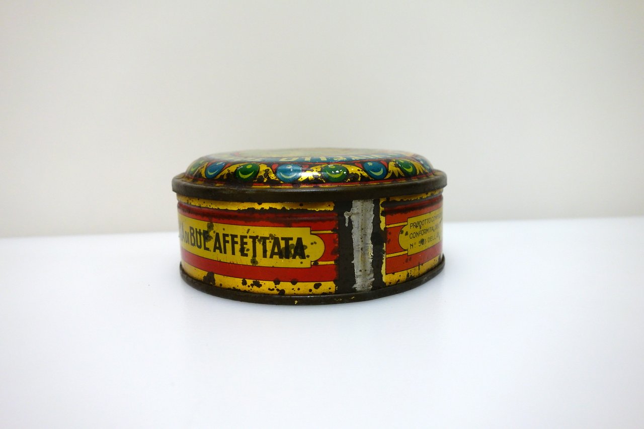 E. Passero e C., Monfalcone - Milano, 1929; scatola di latta d'epoca per alimenti, di forma circolare, con bella grafica cromolitografica. Diametro: cm 11.