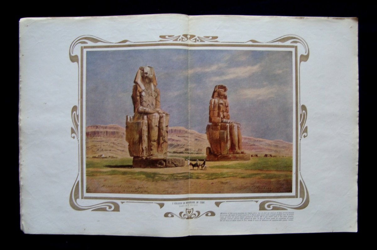 Rivista, Scena Illustrata" - Rivista quindicinale di letteratura arte e sport - - Anno LXIII Firenze, 1-15 Aprile 1926 Fascicolo doppio (7-8) Firenze, 1926; 35,5x28 cm., pp. 28 con molte ill. fot. in b. n. e a colori n. t. e a p.p., + tavola f.t. ill a colori " I Colossi di Memnone in Tebe" di H.Heubner (vedi foto); brossura ed. ill. a colori. Condizioni di conservazione Esemplare in buone condizioni con tracce d'uso; brossure con minuscoli strappetti ai margini e al dorso; cuffia inf con strappetto ci circa 2 cm; tavola f.t. con leggere bruniture ai margini; pag 13-16 staccate dal corpo; interni buoni con leggerissime bruniture. Numero completo. RVS001N00580 blu "