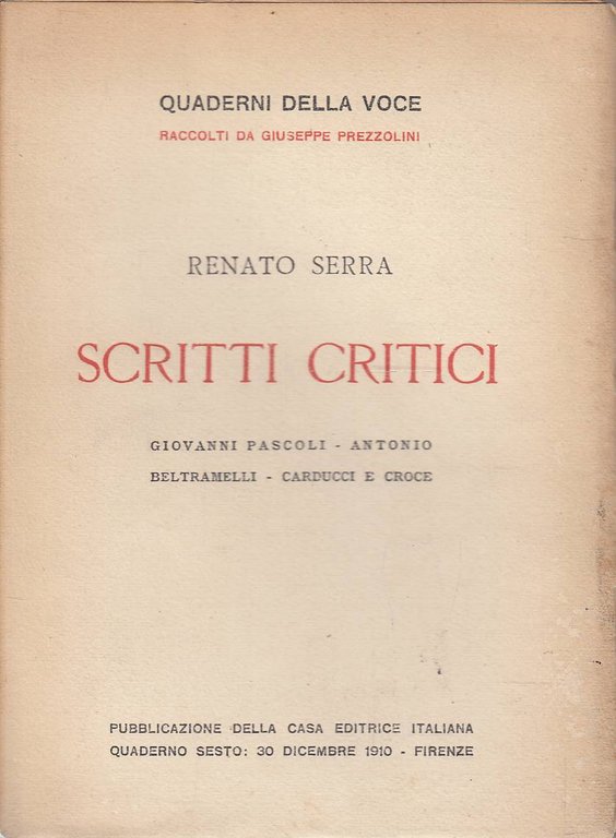 Collana Quaderni della voce, raccolti da Giuseppe Prezzolini, quaderno VI, 1910. Scritti su Giovanni Pascoli, Antonio Beltramelli, Carducci e Croce. Brossura, 14,5x19,5 cm, 113 pg. Ottimo, leggermente brunito.