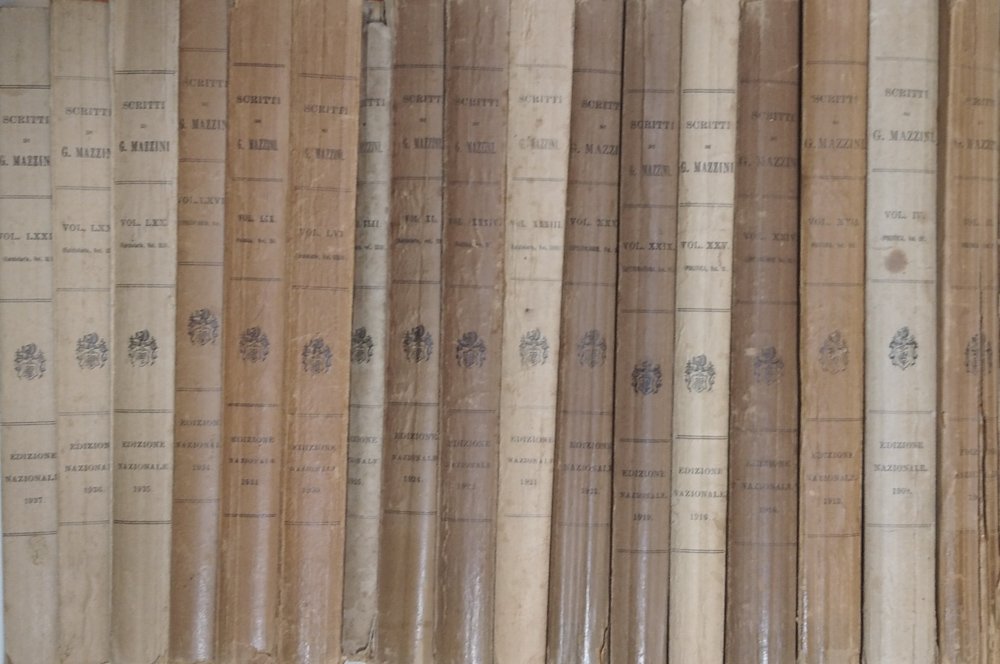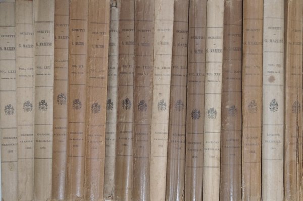 Diciassette volumi con diversi anni di edizione: Vol.III anno 1907, Vol. IV anno 1908, Vol.XVII anno 1913,Vol.XXIV anno 1916, Vol.XXV anno 1916, Vol.XXIX anno 1919, Vol.XXXII anno 1921, Vol.XXXIII anno 1921, Vol.XXXIV anno 1922, Vol.XL anno 1924, Vol. XLII anno 1925, Vol.LVI anno 1930, Vol.LIX anno 1931, Vol.LXVIII anno 1934, Vol.LXX anno 1935, Vol.LXXI anno 1936, Vol.LXXIV anno 1937, di cui sei di politica, undici epistolari e uno di letteratura. Brossure in discreto stato, presentano segni di usura, aloni, risvolti, sfilacciamenti, gore, strappi alle estremità, volumi 24 e 32 hanno un timbro nel piatto anteriore, testo completamente fruibile. Pagine imbrunite dal tempo, fioriture, tagli al naturale, la maggior parte ancora attaccati, alcune pagine sono staccate dalla legatura, nel volume 42 la copertina è completamente staccata. Edizione Nazionale degli scritti di Giuseppe Mazzini. Numero pagine 6600 circa.