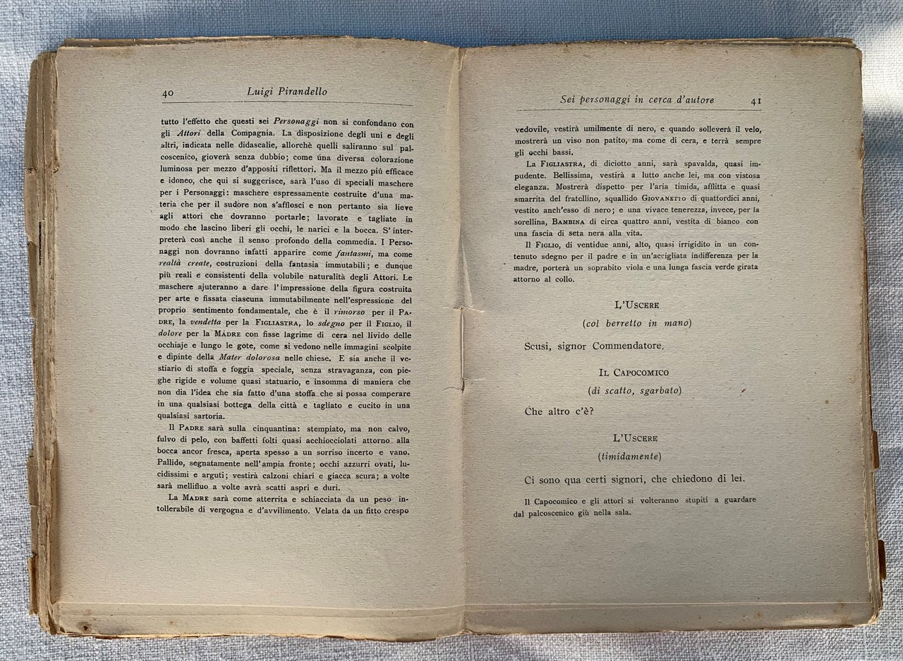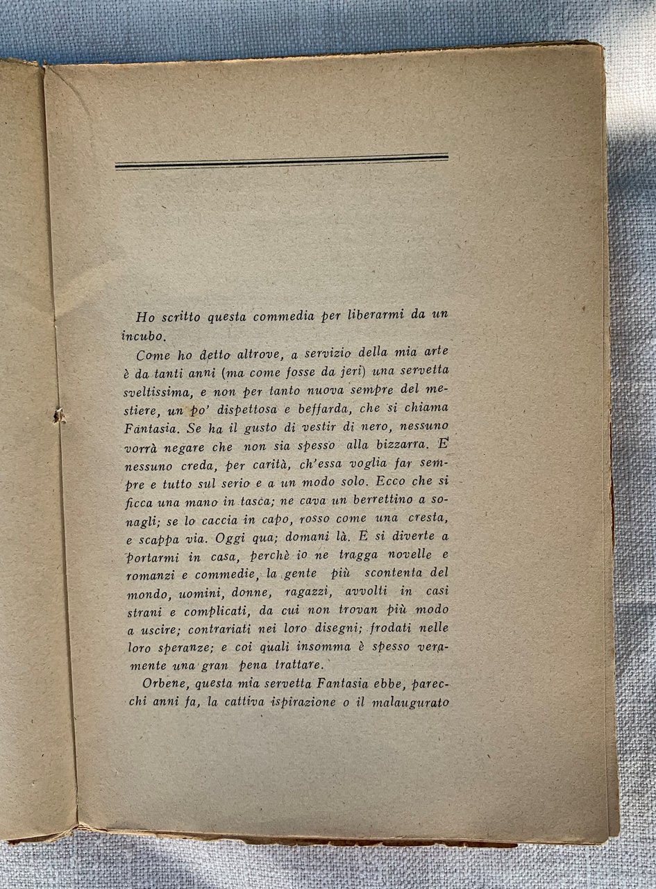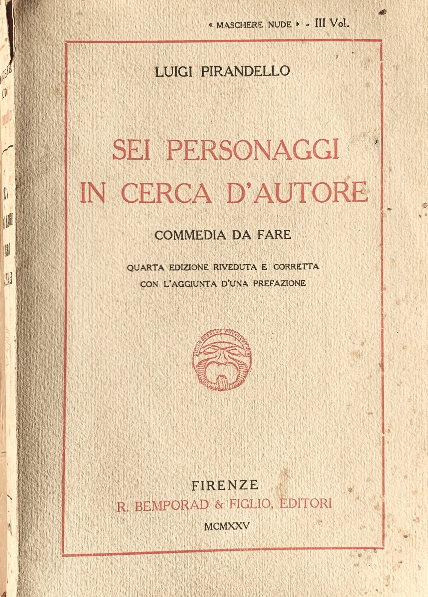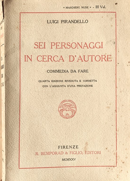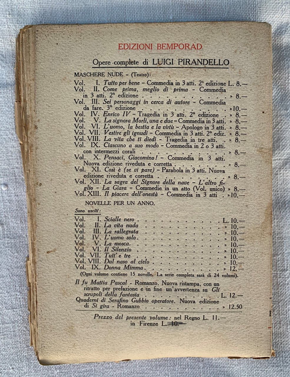 IV ed. riveduta e corretta con l'aggiunta d'una prefazione dell'opera rappresentata per la prima volta il 9 maggio 1921 a Roma presso il Teatro Valle (ed. originale: Firenze, Bemporad 1921). Collezione "Maschere nude", Vol. III. XVI grande/ 160/ brossura in cartoncino ruvido avorio e con titoli in nero e rosso. Stato buono discreto (stato d'uso della copertina ai margini - copertina ingiallita in particolare al dorso e ai margini e con piccole e meno piccole fioriture - firma di possesso ad inchiostro nero all'occhiello (p. 1) - pagine lievemente ingiallite e con piccole fioriture)