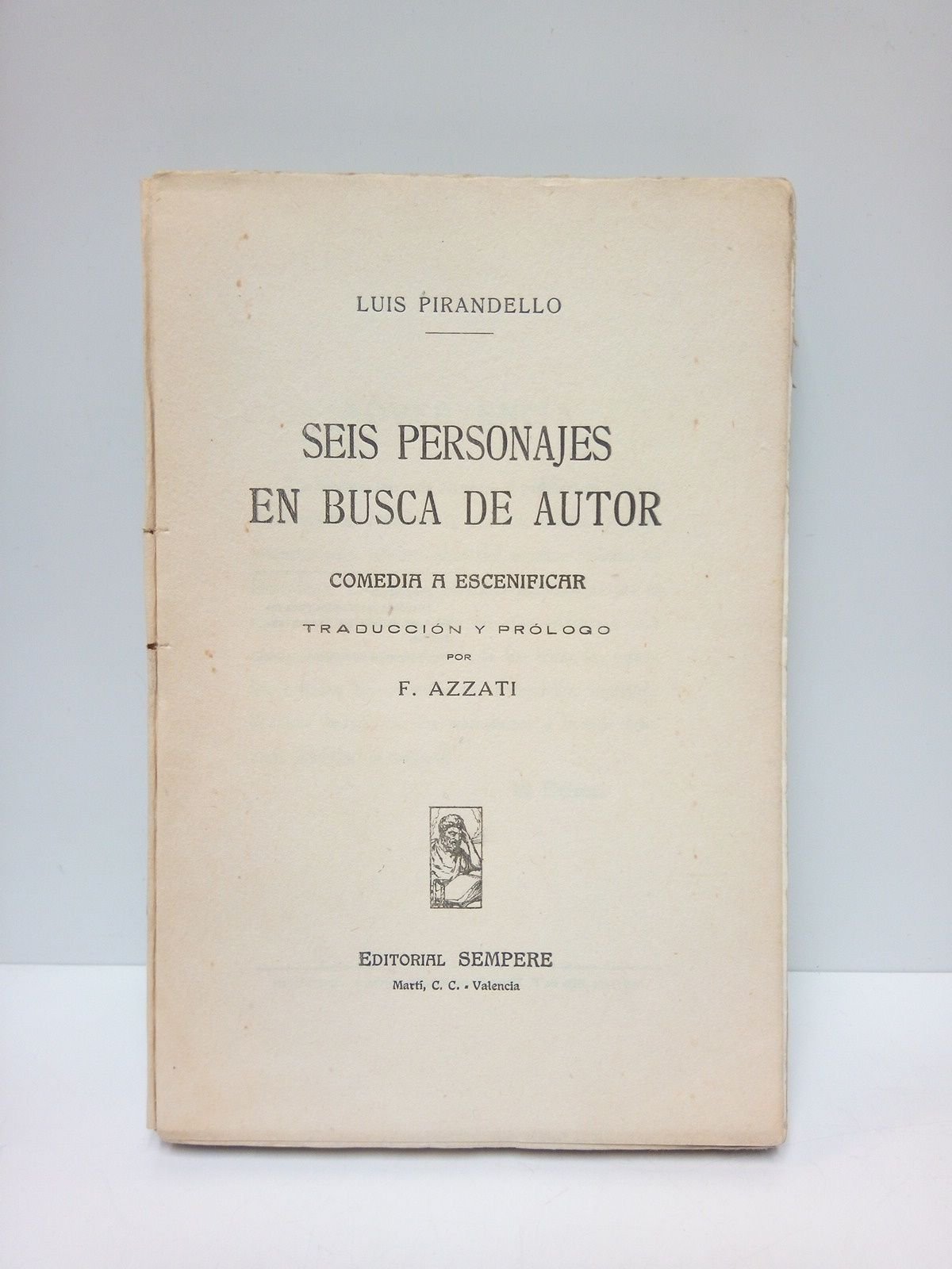 Valencia: Ed. Sempere, [ca. 1915].- 154 p.: Retrtato de Pirandello abriendo el prólogo; 8º mayor (19,1 x 12,8 cm); Cubierta anterior provisional.* Falto de la cubierta anterior que se ha remplazado por otra de papel para su protección. Lomo ligeramente reforzado. TEATRO EXTRANJERO DE LOS SIGLOS XVI-XXI
