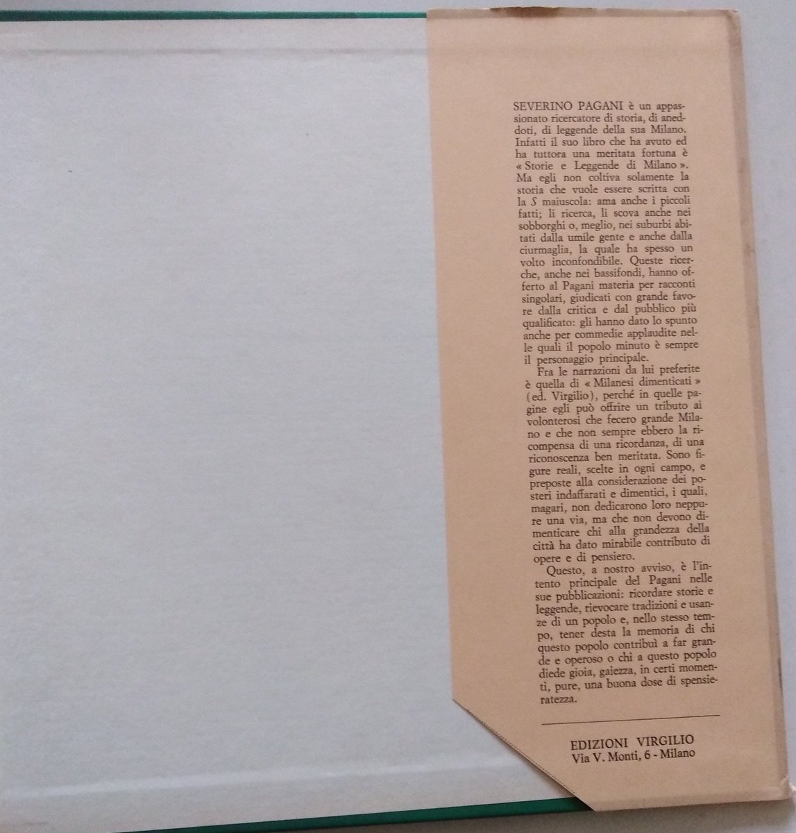 Severino Pagani, Il Barbapedanna a altre figure e figurine della Milano di ieri Edizioni Virgilio, Milano, 1974; cm. 24.5x21.5, pp. 159; con tavv. in b/n f.t. e a p.pag.; cartonato ed. rilegato con sovracop. ed. ill. a col. Condizioni di conservazione Esemplare in buono stato con leggere tracce d'uso; sovracoperta editoriale con angolo inferiore bandella posteriore mancante (vedi foto); brossura editoriale con alcune macchiette; interni leggermente bruniti. SETT144.L14370 MT