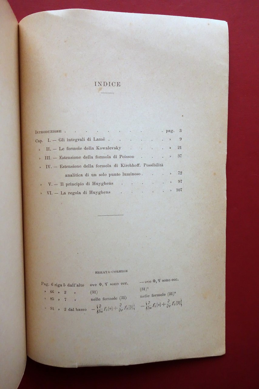 A. Signorini, Sulla teoria analitica dei fenomeni luminosi nei mezzi cristallini uniassici Stab. Tipografico Succ. FF. Nistri, Pisa 1911; cm 25x16; pp. 134; brossura ed. Condizioni di conservazione Complessivamente in buone condizioni, ancora intonso (mai sfogliato); brossura con piccole diffuse bruniture, quella posteriore con un piccolo marginale strappetto. Pagine lievemente ingiallite a causa dell'età e del tipo di carta (vedi foto). Uno dei primi lavori del noto fisico e matematico, compiuto a soli 23 anni. Esemplare ancora intonso (mai sfogliato). SETT95.L25735 N