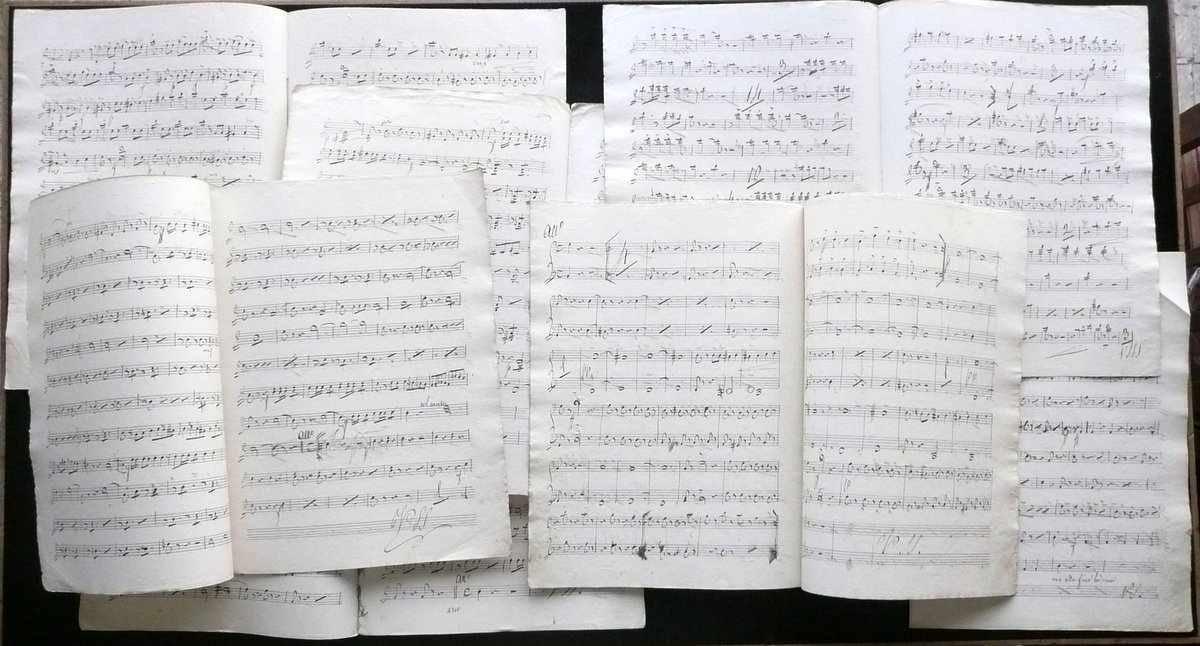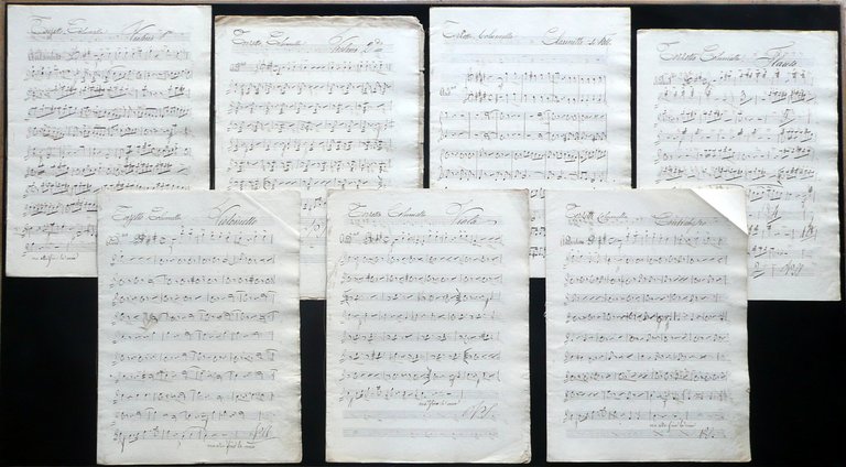 Sette spartiti manoscritti, Terzetto Columella Sette spartiti manoscritti per Volino 1° - Violino 2° - Contrabbasso - Violoncello - Viola - Clarinetti - Flauto - Metà Ottocento circa S. d. (metà Ottocento circa); 7 spartiti interamente manoscritti su carta, ognuno dei quali relativo a uno specifico strumento indicato al margine sup. della prima pagina (vedi foto); pp. 48 complessive, non numerate. Spartiti tra loro sciolti, ma ciascuno legato artigianalmente con cordella e/o per mezzo d'incollatura al dorso (vedi foto). Tutti gli spartiti sono stati siglati al termine del testo. Cm circa 33x24. Condizioni di conservazione Esemplari tutti in buone condizioni con tracce d'uso; qualche piccola lieve brunitura; angoli di qualche pagina con una lieve traccia di piega; margine est. dell'ultima pagina dello spartito relativo al primo violino con una piccola mancanza che non interessa il testo; margini est. di qualche pagina con alcuni minimi strappetti. SC03.D10758 N