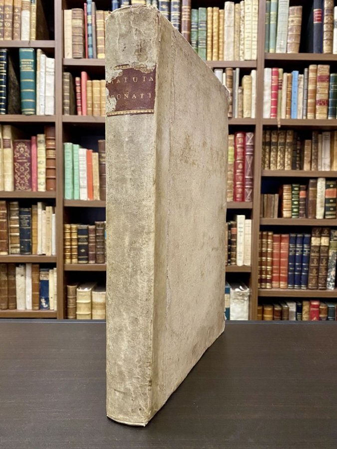 In-folio (cm. 38,7), legatura coeva in mezza pergamena con titolo in oro su tassello al dorso (lievi tracce d'usura), tagli spruzzati; pp. [32] 152, [2] 134, 88, [2b] 29 [3] su carta greve, in buono stato; antica integrazione al bordo del frontespizio e gora al margine dell'indice; alcuni fascicoli legati in ordine scorretto ma tutti presenti; dedica manoscritta al risguardo (1928). Bell'edizione «ex antiquissimo gotico manuscripto codice» che supera la cinquecentesca, Venetiis 1537. Un caposaldo giuridico della terra di Lonato (Brescia) contenente anche i privilegi concessi dalla Serenissima, i patti daziari, le discipline di governo lonatese e le concessioni di Milano e Mantova. La versione in volgare sarà successiva, Venezia 1794. Cfr. Manzoni I, 238. Buon esemplare. (SG6)
