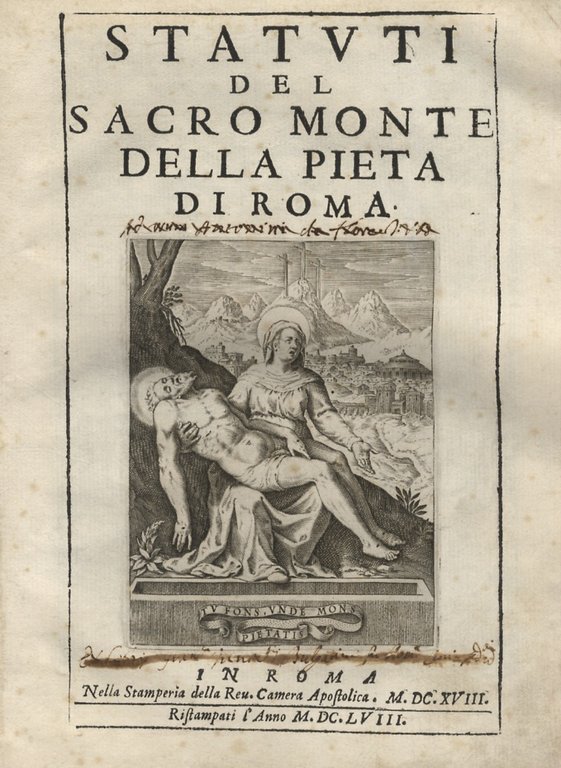 Statuti del Sacro Monte della Pietà di Roma. In Roma, nella stamperia della rev. Camera Apostolica, 1618, ristampati l'anno 1658 (in fine: In Roma, nella stamparia della Camera apostolica, 1617), pp. [6], 130, con vignetta al front. e una tav. f.t. di stemmi, entrambe in calcografia. [Legato con:] Bolle, et privilegi del sacro Monte della pietà di Roma. In Roma, nella stamperia della Rev. Camera Apostolica, 1618, ristampati l'anno 1658 (in fine: In Roma, nella stamperia della Rev. Cam. Apost., 1658), pp. [8], 165, [3], l'ultima carta bianca, con vignetta al front. e una tav. f.t. di stemmi, entrambe in calcografia.