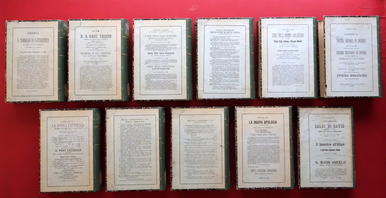 Mons. Pietro Balan, Storia d'Italia di Mons. Pietro Balan già sotto archivista della S. Sede seconda edizione aumentata e corretta dall'autore, curata ed accresciuta di note dal sacerdote dottor Rodolfo Majocchi professore di Storia nel Seminario Vescovile di Pavia 11 volumi - opera completa 11 voll.; Tip. Pontificia ed Arcivescovile dell'Immacolata Concezione, Modena 1894-1899; cm 23,5x15,5; pp. XII-624 (vol. I); pp. 680 (vol. II); pp. 700 (vol. III); pp. 608 (vol. IV); pp. 564 (vol. V); pp. 640 (vol. VI); pp. 548 (vol. VII); pp. 592 (vol. VIII); pp. 540 (vol. IX); pp. 544 (vol. X); pp. 352 (vol. XI-indici generali); legatura d'epoca in mezza tela con titolo e fregi impressi in oro al dorso, piatti marmorizzati con applicate le brossure ed. originali dei volumi. Al frontespizio (e in alcuni casi all'antiporta o al risguardo ant.) dei volumi timbro di vecchia biblioteca, esemplari regolarmente annullati. Alle cuffie applicate vecchie etichette. Opera completa in 11 volumi. Condizioni di conservazione Buone condizioni con tracce d'uso; coperte con qualche minima abrasione ai margini dei piatti e alle cuffie, cuffie superiori con lievi / leggere abrasioni; tagli superiori con leggere tracce di sporco. Interni buoni con bruniture per lo più di leggera entità. Opera molto rara da reperirsi completa di tutti gli undici volumi. Seconda edizione del 1894-1899, meno tendenziosa e lacunosa della prima in quanto riveduta e arrcchita di numerose note. Monumentale pubblicazione storiografica, che nel suo genere fece scuola" e che, all'epoca, godette di una certa notorietà. Punto di riferimento della corrente storica di pensiero conservatore. SETT229.L24918 N "