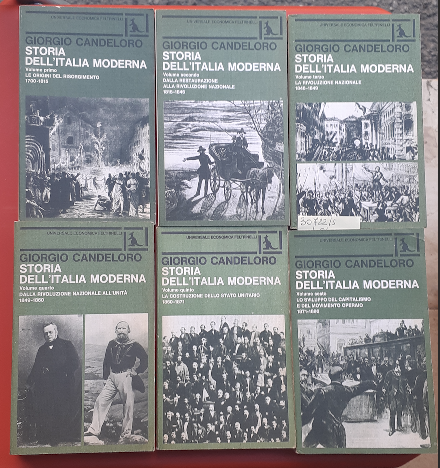 Feltrinelli 1977, rist., Universale Economica 796-797-798-799-800-801, opera incompleta ma sei volumi in brossura con copertine diversamente ill., vol.I Le origini del Risorgimento 1700- 1815, vol.II Dalla restaurazione alla rivoluzione nazionale 1815-1846, vol.III La rivoluzione nazionale 1846-1849, vol.IV Dalla rivoluzione nazionale all'Unità 1849- 1860, vol.V La costruzione dello Stato unitario 1860-1871, vol. VI Lo sviluppo del capitalismo e del movimento operaio 1871- 1896., pp.445, 492, 530, 586, 476, 526. I volumi sono in condizioni molto buone