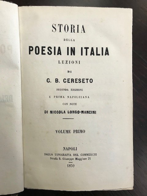 Storia della poesia in Italia. Seconda edizione e prima napolitana con note di Niccola Longo-Mancini. | Libri antichi e moderni | Cereseto Giovanni Battista.