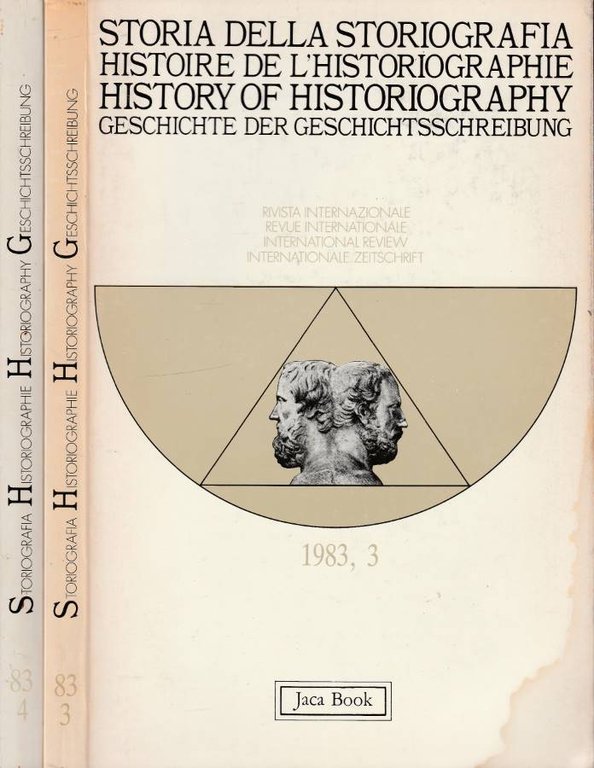 Anno 1983 non completo, presenti solo vol 3, 4. Italiano inglese, francese, tedesco. Organo della Commissione Internazionale di Storia della Storiografia del Comitato Internazionale di Scienze Storiche. I volumi si presentano in buono stato di conservazione. Il dorso e le copertine mostrano lievi segni di usura. Le pagine interne sono ingiallite dal tempo e fruibili. I tagli bruniti e regolari con macchioline di fioritura. La cerniera è ben salda. Numero pagine 159+153. Totale pagine 312