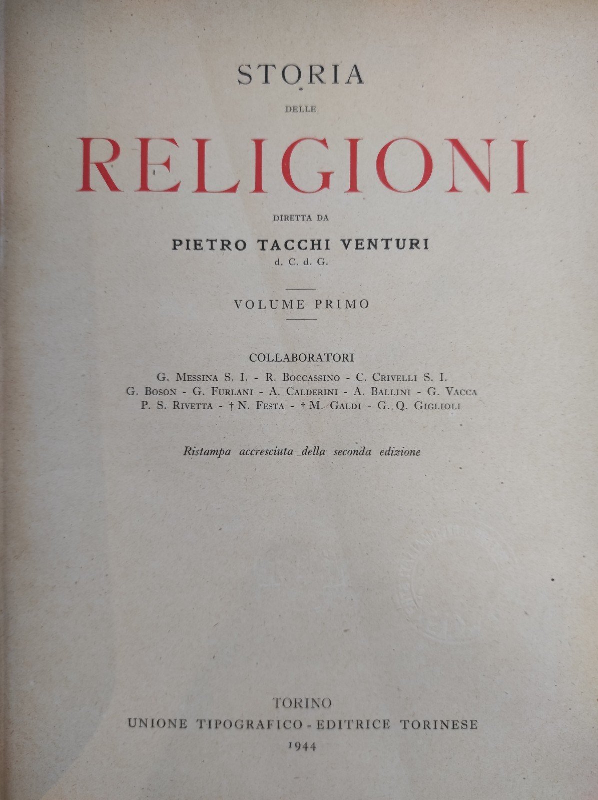 Vol. 1: L'indagine religiosa nella sua storia e nei suoi metodi, La religione dei primitivi, La religione dei popoli che abitavano il Messico e l'America centrale, La religione Sumero-Accadiana e Babilonese-Assira, La religione degli Hittiiti, La religione degli egiziani, Le religioni dell'India, La religione dei cinesi, La religione dei giapponesi, Le religione greca, La religione dei romani, La religione persiana, La religione degli etruschi.