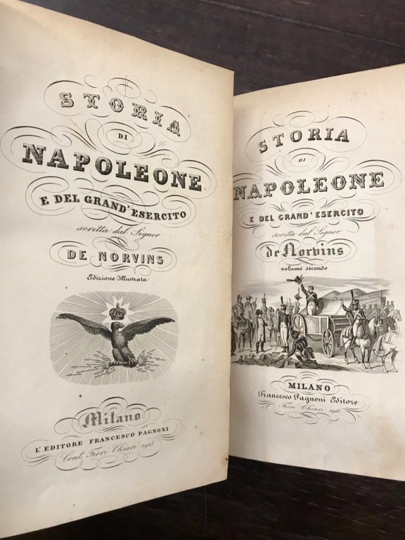 2 volumi in-8° (cm. 22,2), legature coeve in mezza pelle con titolo in oro ai dorsi (lievi segni d'usura), pp. [4] 376, [4] 446 [2] in buono stato con 55 tavole illustrative incise da Gandini, Santa Maria, Clerici, Stoppi, Bucinelli, Sivalli, Guzzi, Mantovani e 4 tavole con facsimile delle lettere di Giuseppina e Napoleone e relative traduzioni; lievissime fioriture sparse e una leggera brunitura. Famosa e suggestiva opera. Buon esemplare. (NL7-2c)