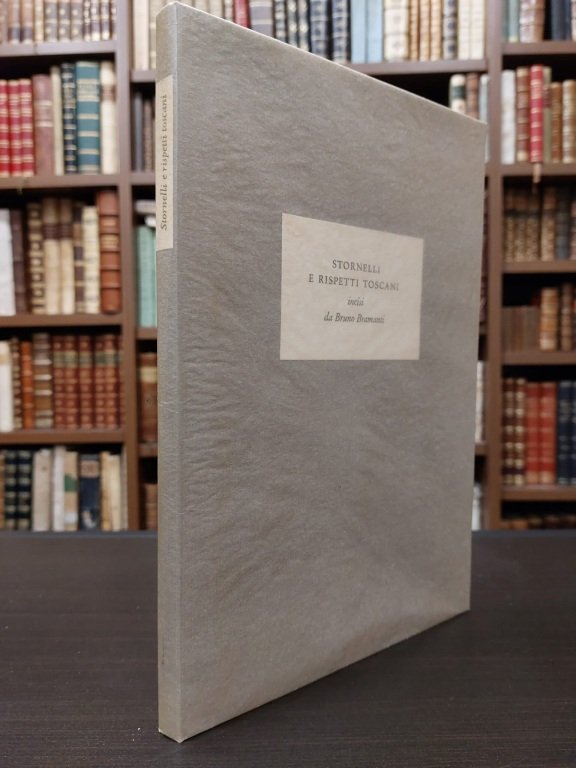 In-8° (cm, 26,7), brossura editoriale con sovraccoperta con titolo in nero su tassello bianco applicato al piatto anteriore; pp. [64] non numerate e suddivise in 10 fogli sciolti ripiegati in 4, in barbe, in ottimo stato. Dodici canzoni popolari raccolte ed illustrate con 38 xilografie di Bruno Bramanti. Tiratura limitata di 150 esemplari su carta a Tino Magnani di Pescia (nostro n. 125). Conservato in astuccio in cartonato rigido. In ottimo stato. (SC4)