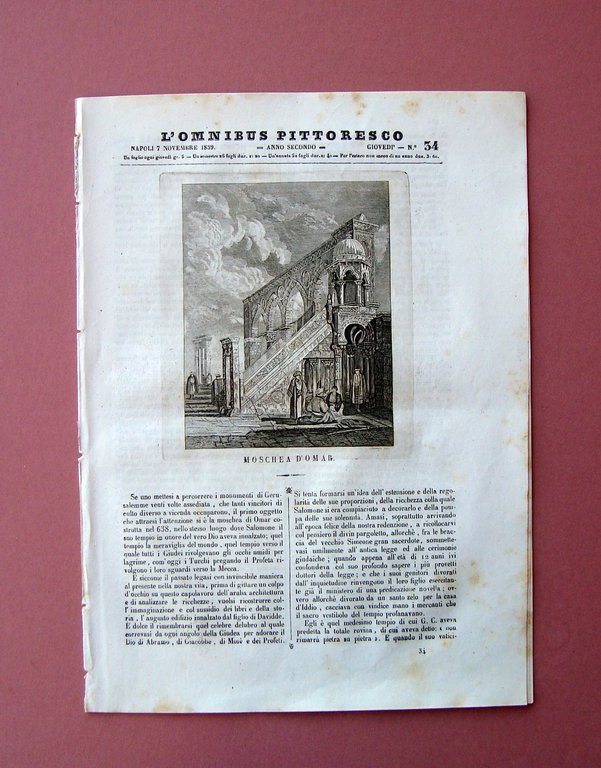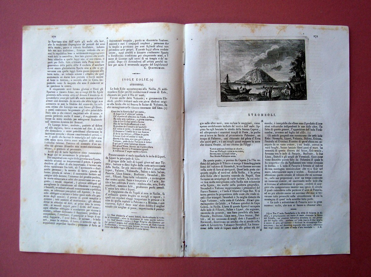 Tip. L'Omnibus, Napoli, 1839; cm 29,5x21,5; pp. 8 da pag. 225 a pag. 232 con num. progr. annuale; fascicolo con grafica dell'epoca e bella incisione + articolo "Stromboli- Isole Eolie".