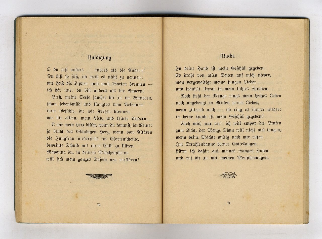 Innsbruck, Tiroler Verlag, [1902], in-16, brossura editoriale decorata con motivi Liberty, pp. 120, [4]. Prima edizione. Ottime condizioni.