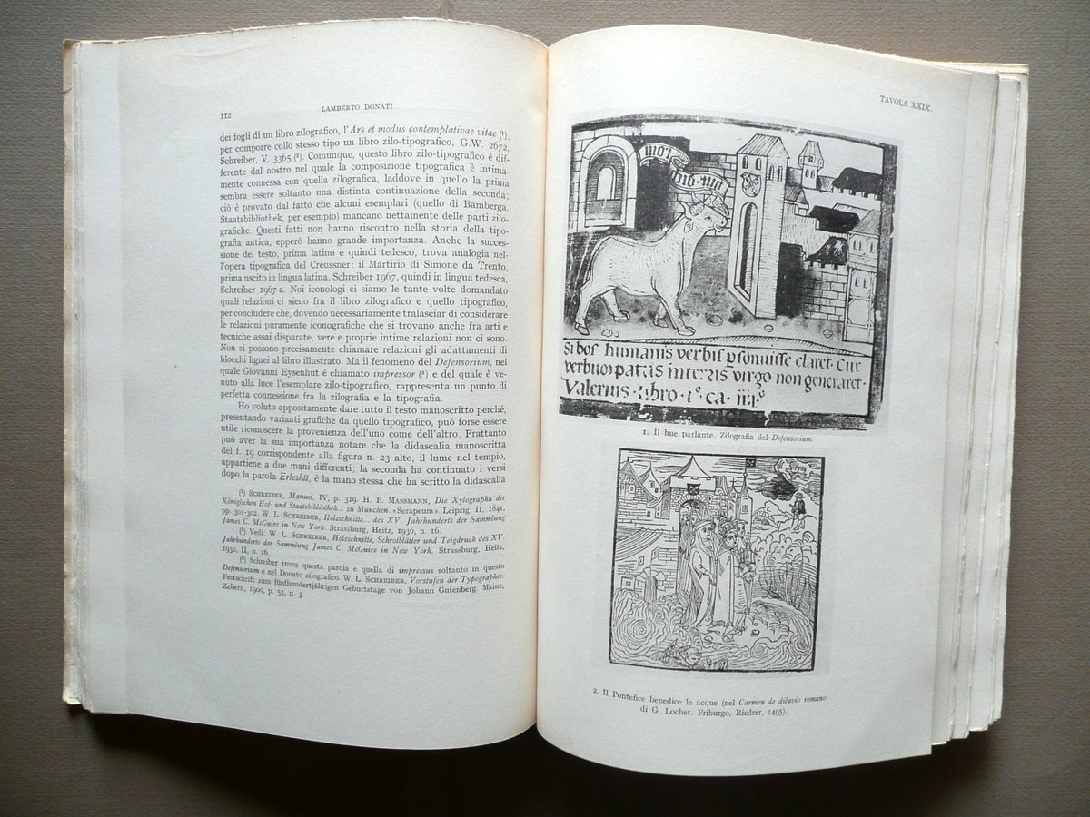 † Studi e ricerche sulla Storia della stampa del Quattrocento Omaggio dell'Italia a Giovanni Gutemberg Nel V centenario della sua scoperta A cura del Ministero della Educazione Nazionale e della Associazione Italiana per le Biblioteche Hoepli, Milano 1942; cm 30,5x21; pp. XVI-376 con LXII tavole in b/n fuori t.; brossura ed. Prima bianca con applicato ex libris del precedente proprietario. † Condizioni di conservazione Esemplare ben conservato con tracce d'uso, brossure con leggerissime tracce di sporco, pochi minimi strappetti e difetti ai margini e agli angoli; dorso con qualche segno di utilizzo. Interni buoni, con una piccola lieve ammaccatura al margine est. di alcune delle ultime pagine. † Bella rara pubblicazione Hoepli sulla storia della stampa, con LXII tavole in bianco e nero fuori testo. † SETT136.L13393 N