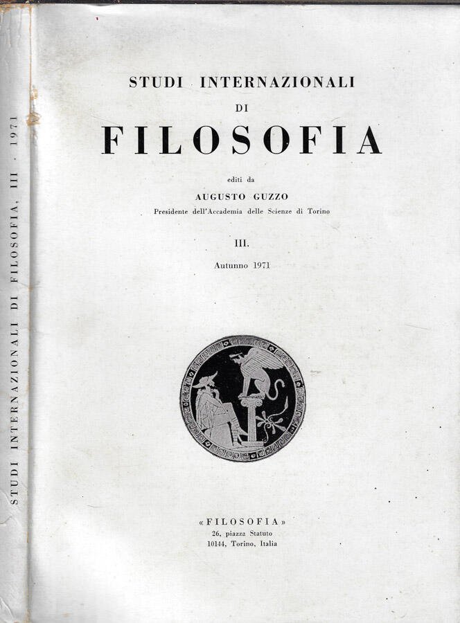 Volume III anno 1971 rispettivamente dell'autunno del periodico "Studi Internazionali di filosofia". Brossura illustrata e lievemente ingiallita dal tempo presentante segni di usura da scaffale ai margini con abrasioni agli stessi e tracce di usura da sfregamento ai piatti. Pagine godibili anche se leggermente ingiallite dal tempo. Bordi a barbe e fogli intonsi. Numero pagine 243.