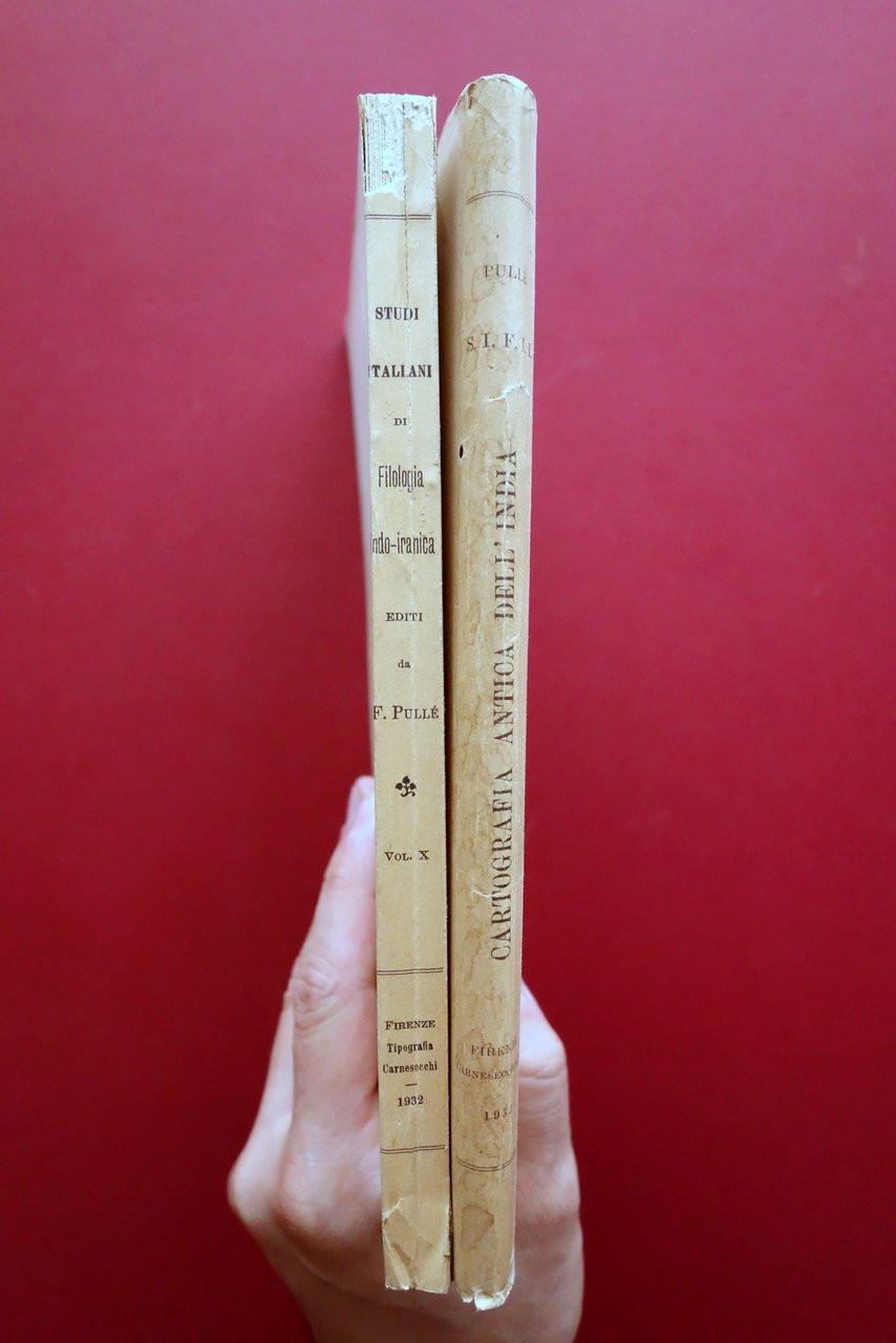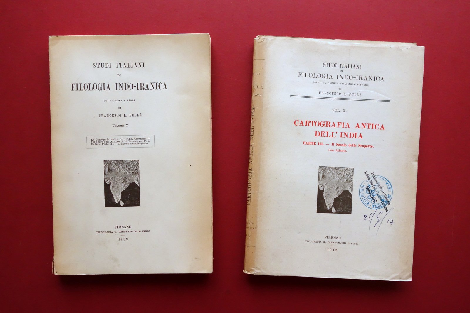 AA. VV., Studi Italiani di Filologia Indo - Iranica diretti e pubblicati a cura e spese di Francesco L. Pullè - Volume X Cartografia Antica dell'India parte III - il secolo delle scoperte con atlante Tip. G. Carnesecchi e Figli, Firenze 1932; cm 23,5x15,5; pp. XXVI-184 con ill. in b/n; brossura ed.; alla prima bianca timbro di biblioteca, esemplare regolarmente annullato. A pagina V dedica autografa firmata del Pullè (volume di testo); Tip. G. Carnesecchi e Figli, Firenze 1932; cm 23,5x16; 7 grandi belle carte in b/n rip. più volte, numerate da 5 a 12 (le tavv. 9-10-11 sono riprodotte sullo stesso foglio ripiegato); brossura ed. Brossura ant. con timbro di biblioteca, esemplare regolarmente annullato (atlante). Condizioni di conservazione Volume di testo e atlante entrambi in buone condizioni con lieve per lo più marginale ingiallimento dovuto al tipo di carta; volume di testo ancora intonso (esemplare mai letto), con una fessurazione di qualche cm alla parte superiore del dorso e una piccola mancanza alla cuffia superiore; cuffia inf. con un minimo strappetto. Atlante in buone condizioni con minime ombre di gore al dorso. Tavole tutte ben conservate, le numero 5 e 12 con qualche minuscolo forellino i quali non compromettono l'immagine (vecchi danni da insetto non più attivo); tavola 12 con una leggera brunitura alla parte inferiore. Volume X della collana, autonomo e completo, che corrisponde alla parte III - Il secolo delle scoperte" della sezione intitolata "La cartografia storica dell'India. Corredata di 104 figure e un Atlante di 22 tavole; per F. L. Pullè". Tale parte III, l'ultima della sezione sopraindicata, è completa dell'atlante corrispondente, che contiene le tavole dalla 5 alla 12. Le tavole sono tutte di pregevole qualità e ripiegate più volte (fanno eccezione le tavole 9-10-11, riprodotte su un unico foglio ripiegato). Al termine del volume di testo indice dell'intera sezione, suddiviso nelle sue singole parti. SETT231.L24611 N "
