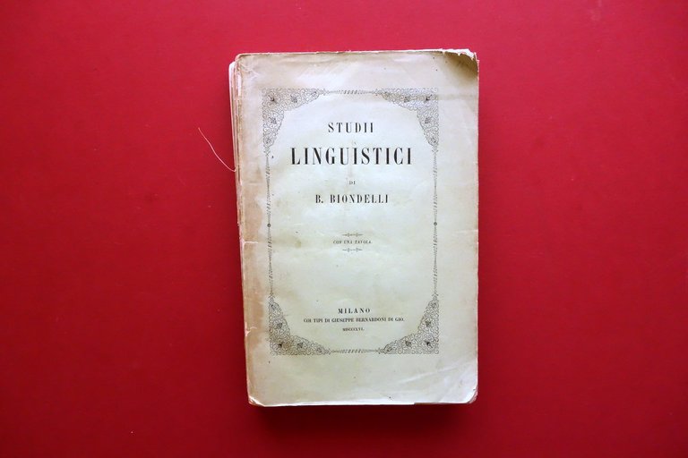 B. Biondelli, Studii linguistici di B. Biondelli membro effettivo dell'I. R. Istituto Lombardo Onorario della Società Filologica di Londra e di parecchie altre d'Europa Coi Tipi di Giuseppe Bernardoni di Gio., Milano 1856; cm 23x15,5; pp. XLVI-380 con una tavv. incisa in b/n raffigurante il monumento scultoreo per il Conte Carlo Ottavio Castiglioni (A. Galli scul. - Alfieri inc.); interni marginosi con barbe. Brossura ed. d'attesa. Condizioni di conservazione Condizioni discrete con tracce d'uso; brossura d'attesa con qualche piccola leggera macchietta e leggere tracce di pieghette; brossura post. con due mancanze di cui una di alcuni cm alla parte superiore; dorso fessurato e con alcune piccole mancanze, con conseguente allentamento dei fascicoli e distacco a metà dell'esemplare (vedi foto). Interni buoni con leggero foxing. Raro, completo della tavola. Tra le prime pubblicazioni sistematiche e scientifiche della linguistica moderna. Per maggiori informazioni vedi foto indice. SETT95.L25737 N