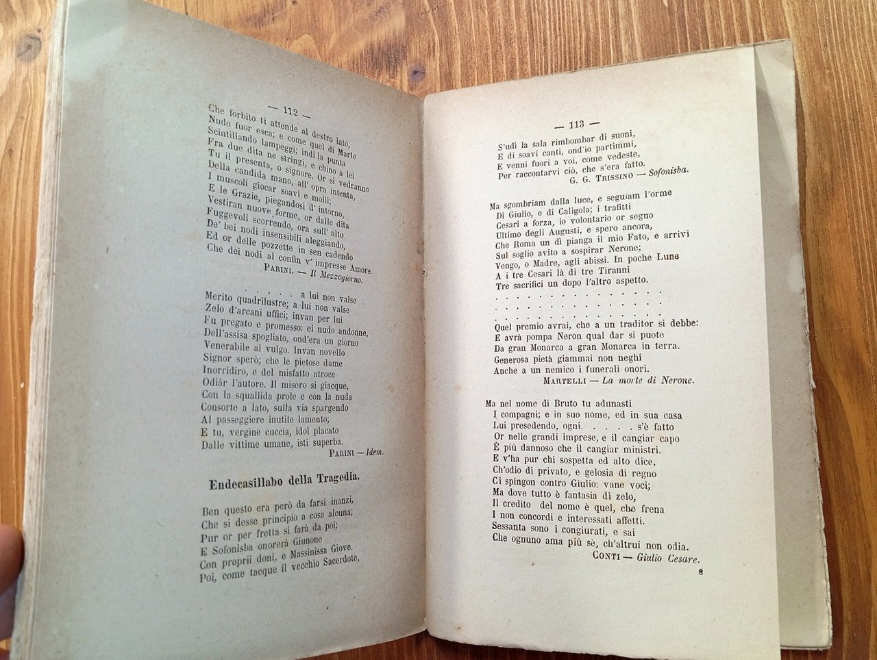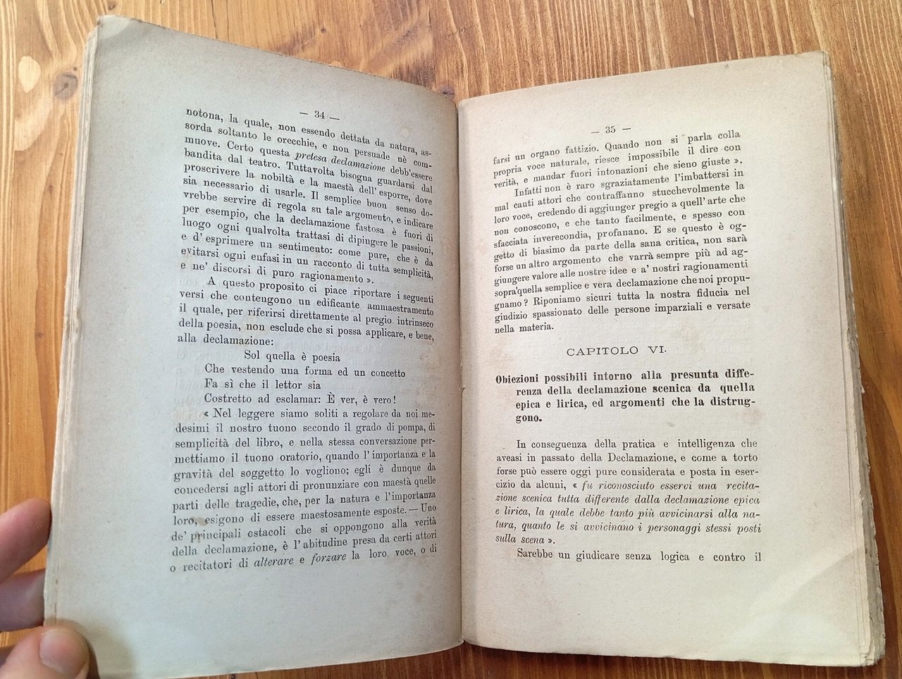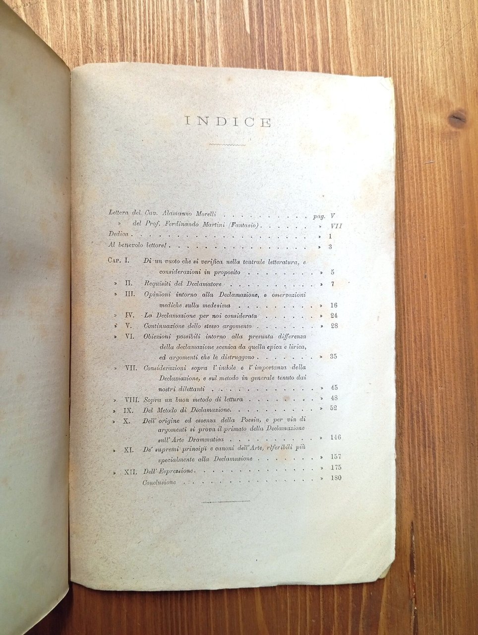 Prima edizione. Al frontespizio: Studj sulla declamazione - Brossura editoriale con dorso rifatto in carta, XII-183 pagine. Indice integrale visionabile nelle nostre immagini. Ordinarie fioriture e segni del tempo, nel complesso esemplare ben conservato, ancora intonso, di un testo non comune -- Giuseppe Soldatini fu membro di diverse società filo-drammatiche, letterarie e scientifiche.