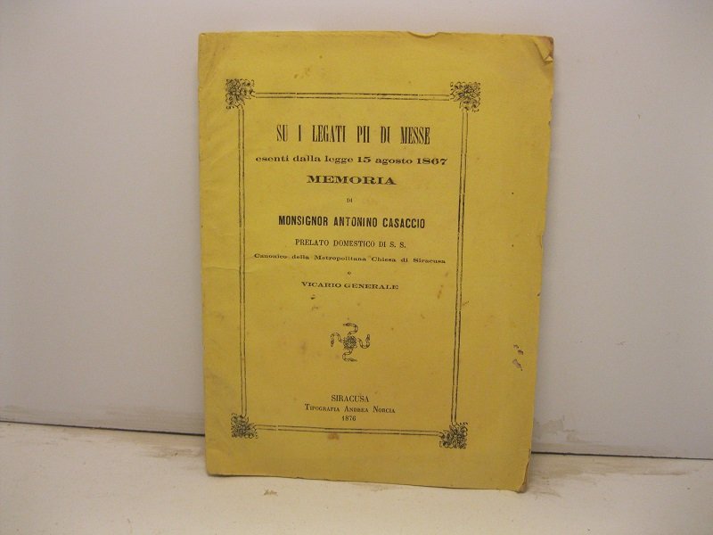 Su i legati pii di messe esenti dalla legge 15 agosto 1867 | Libri antichi e moderni | Casaccio Antonino