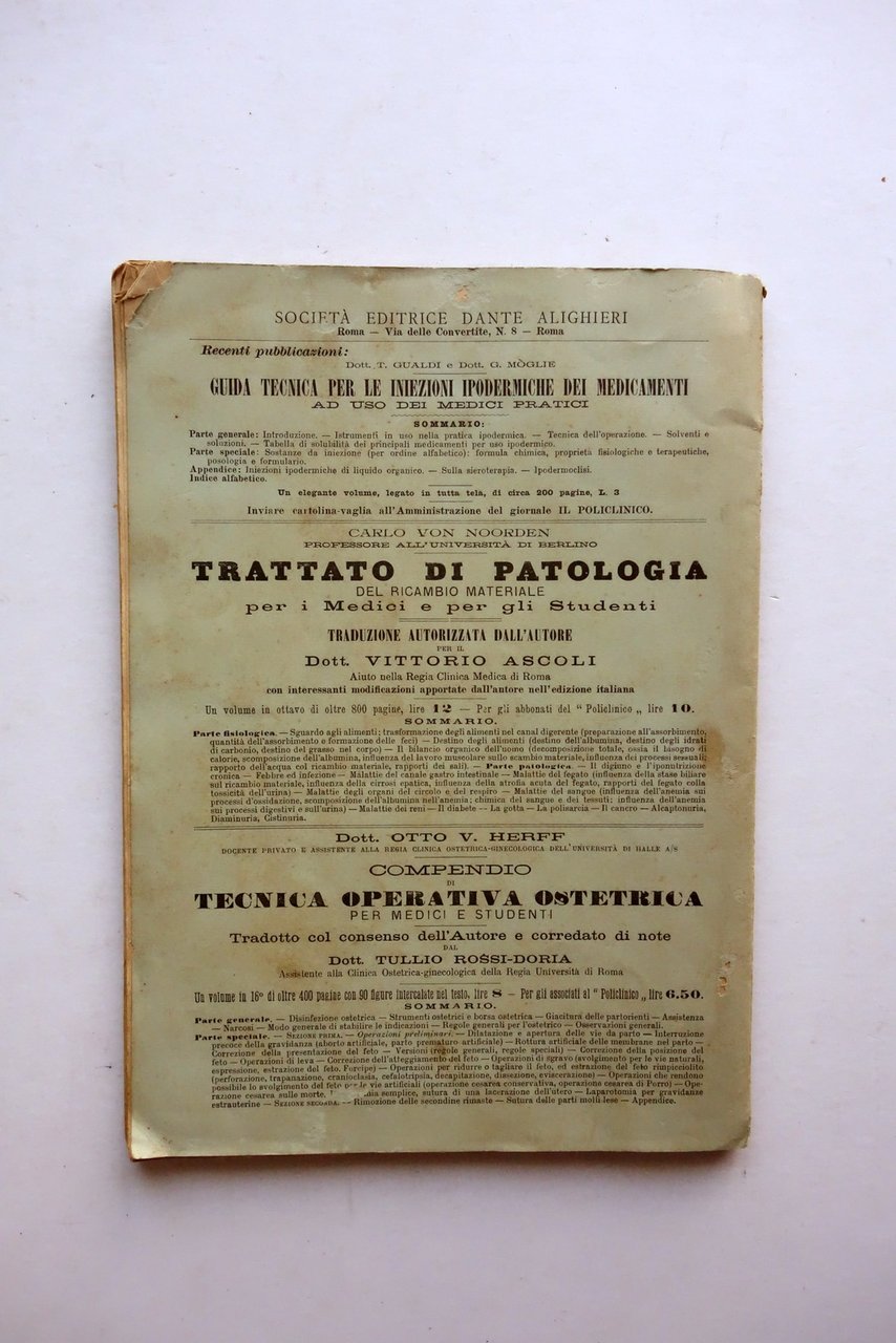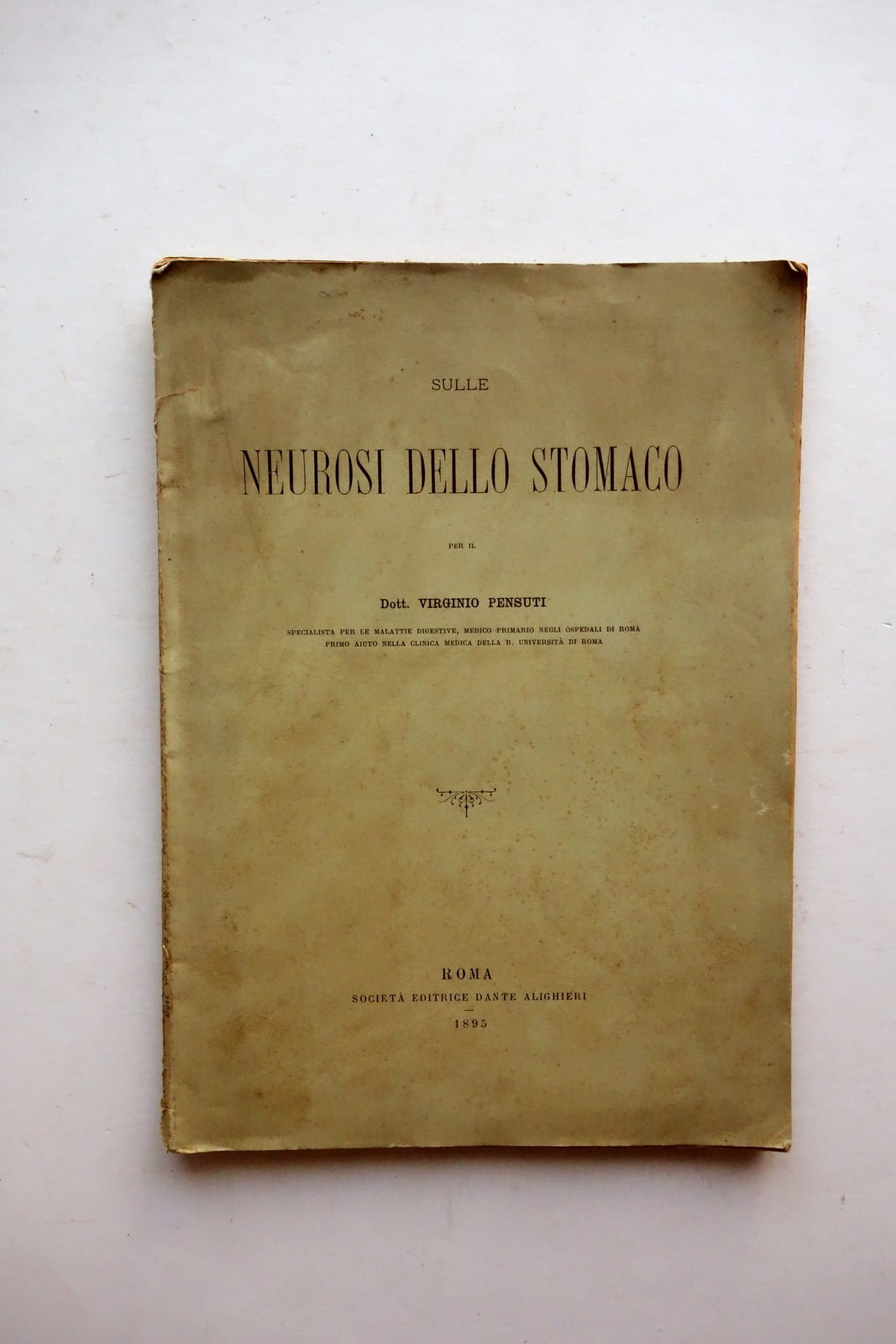 Dott. Virginio Pensuti, Sulle Neurosi dello Stomaco Soc. Ed. Dante Alighieri, Roma 1895; cm 26x18,5; pp. 88-[2]; brossura ed. Condizioni di conservazione Condizioni pi√π che discrete con tracce d'uso e leggeri segni del tempo, alcune leggere bruniture, angoli lievemente sgualciti, cuffie con piccole / minime mancanze; angolo superiore della brossura post. con una minima mancanza. Leggero marginale ingiallimento delle pagine dovuto al tipo di carta. SETT158.L24309 N